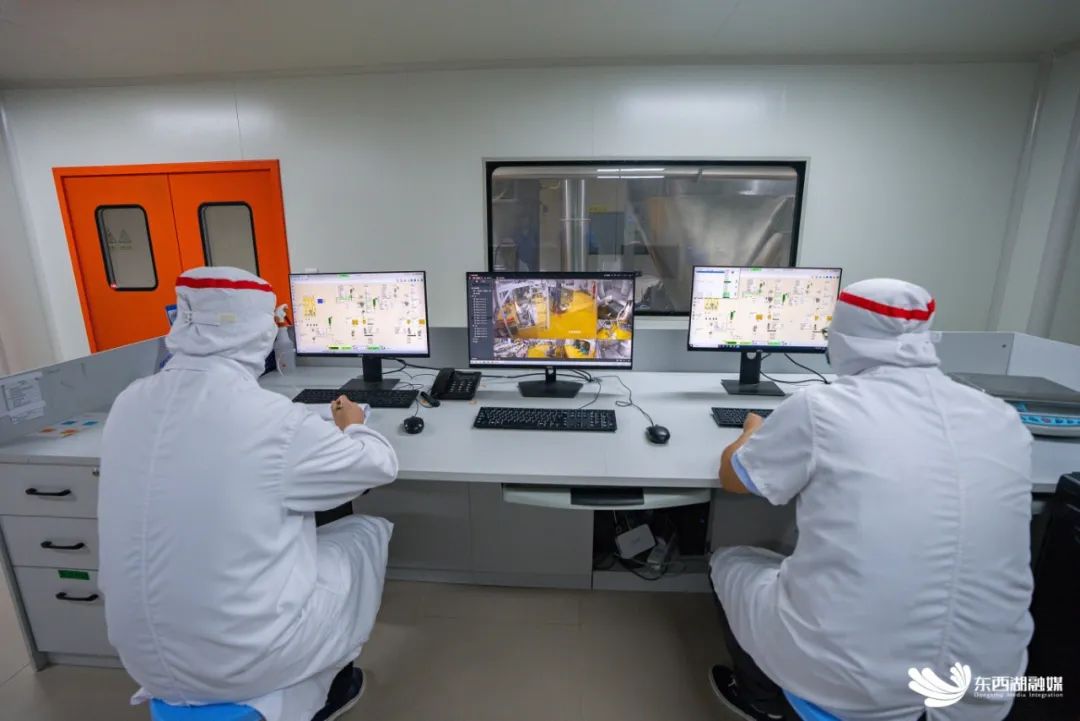 生产线高度自动化,工作人员通过中控室显示器实时查看机器运转情况。