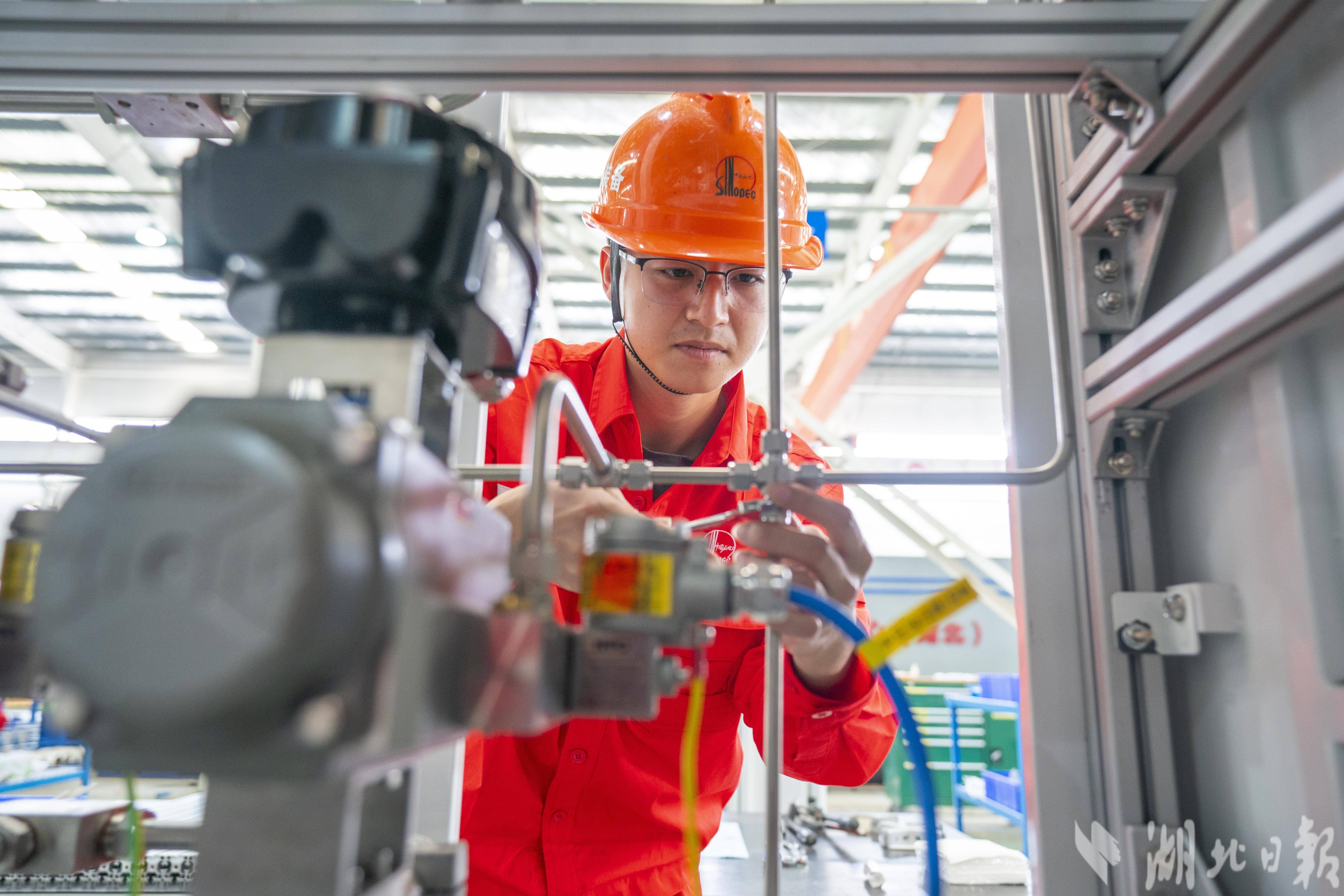 4月11日,武汉东西湖中国石化氢能装备制造基地,技术人员正在组装、检测氢能设备。4月12日,中国石化氢能装备制造基地在武汉正式揭牌。该基地是中国石化氢能产业链链条中的重要一环,已取得多套加氢站设备订单。目前,石化机械已具备为用户提供标准化加氢站解决方案和制氢加氢一体化解决方案能力,在制氢、输氢、加氢等领域为用户提供关键装备产品、技术与服务。该公司多种氢能装备投放市场,去年以来订单量同比显著增长。近年来,石化机械积极开拓加氢、制氢等领域市场,发展氢能装备产业,掌握多项关键核心技术,取得相关专利50余项。当前,湖北正构建“氢”产业链,发展新质生产力,加快打造氢能装备制造先行区。