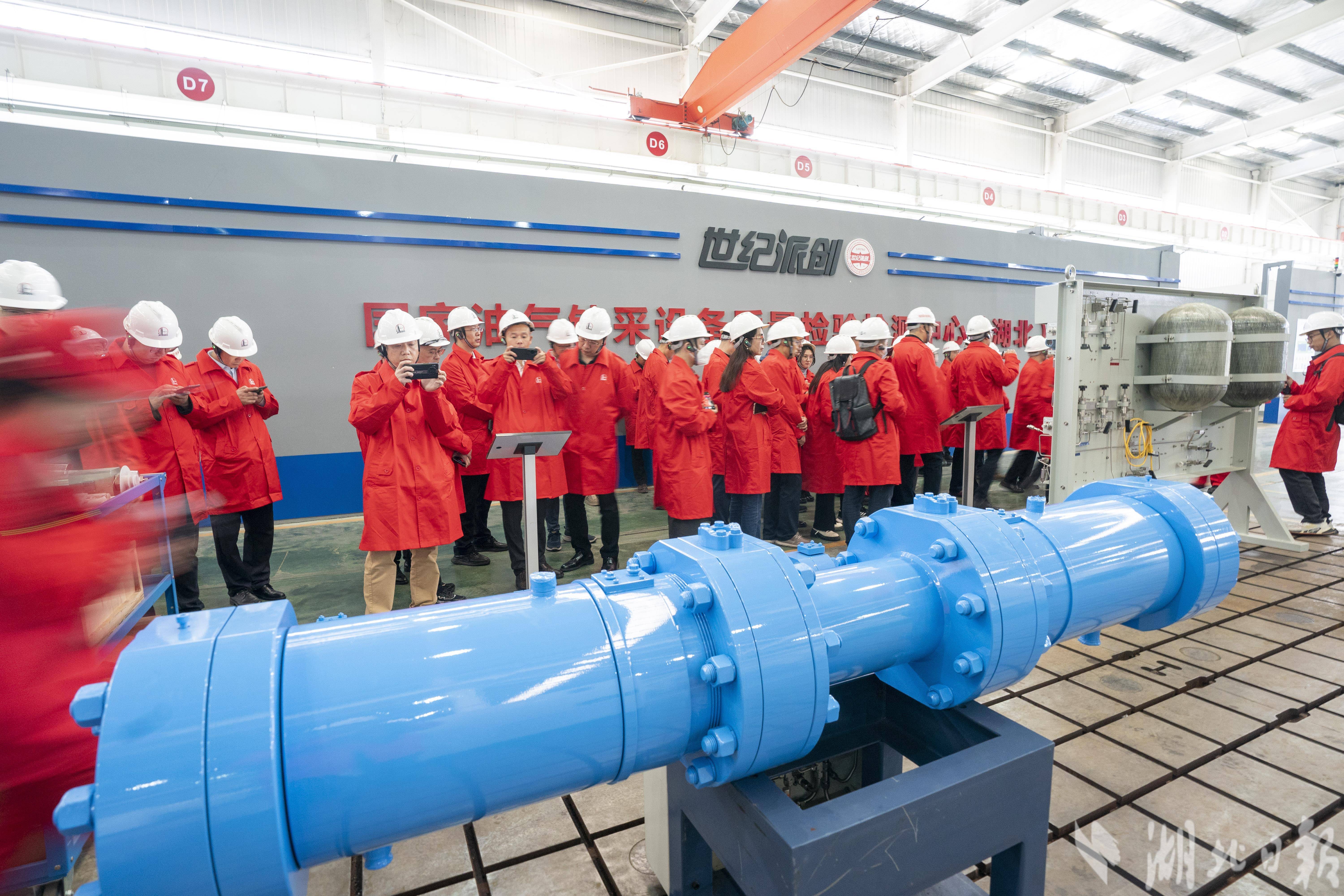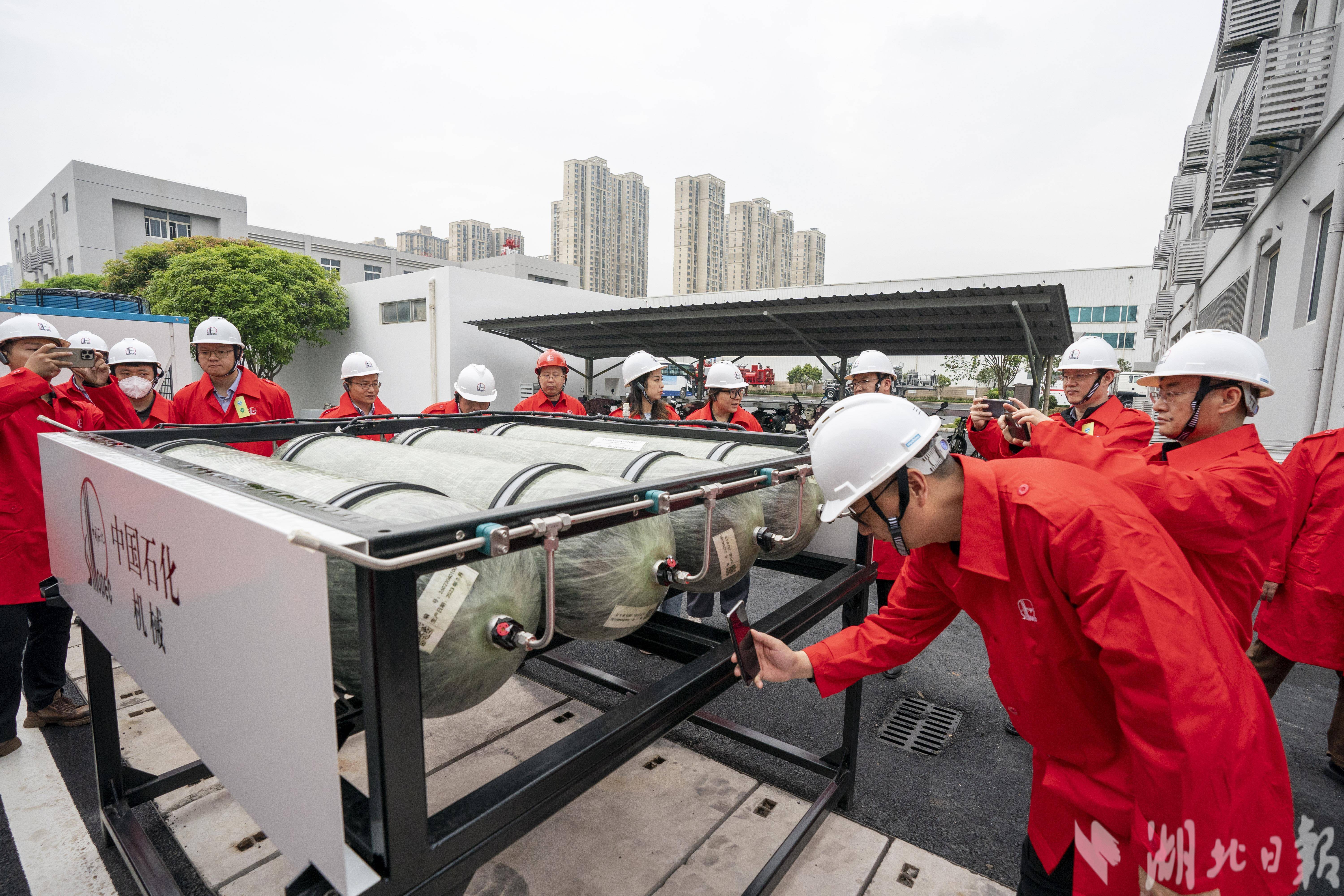 图为参加氢能应用现代产业链高质量发展推进会的与会嘉宾参观中国石化氢能装备制造基地生产的氢能装备。