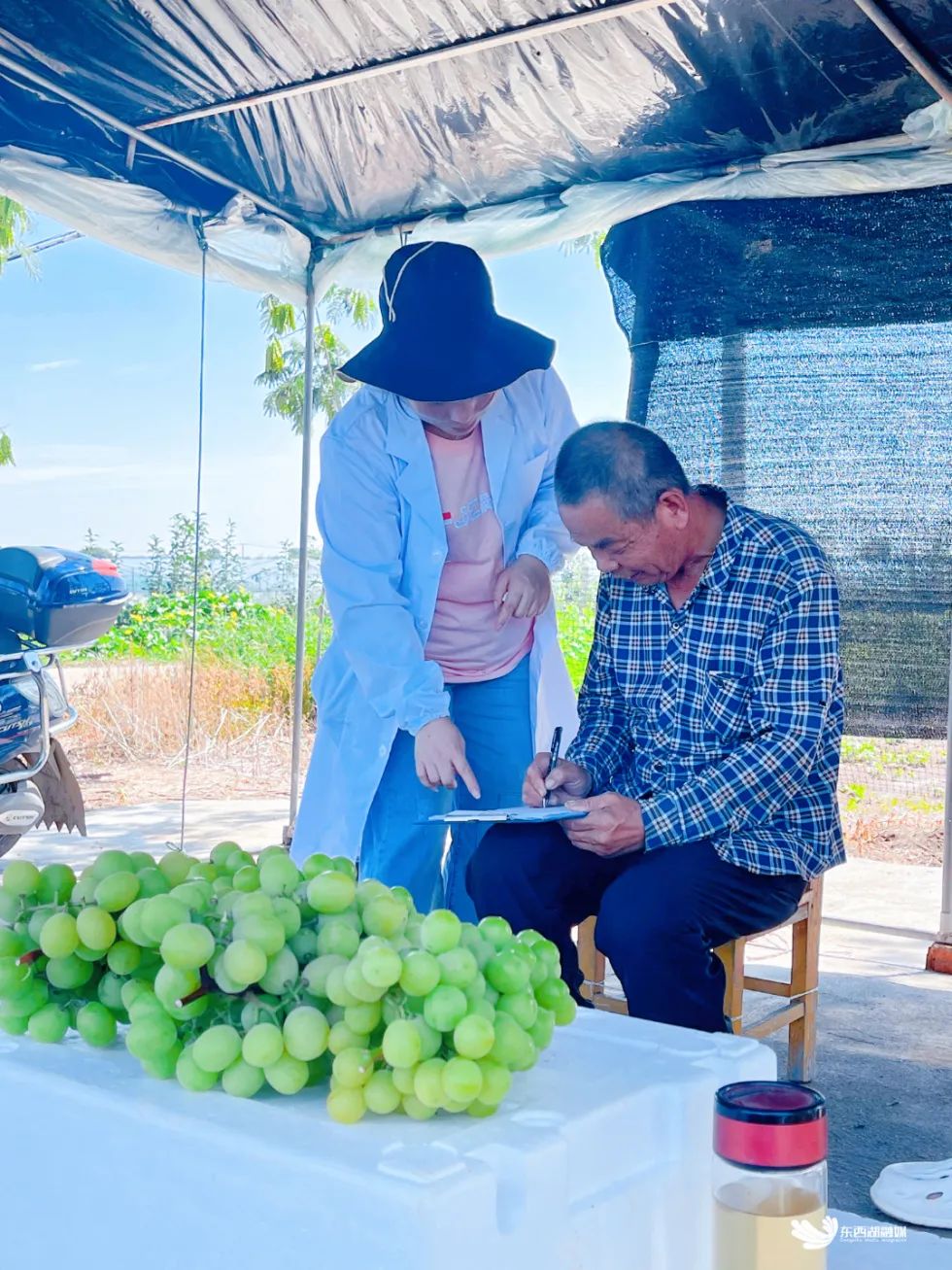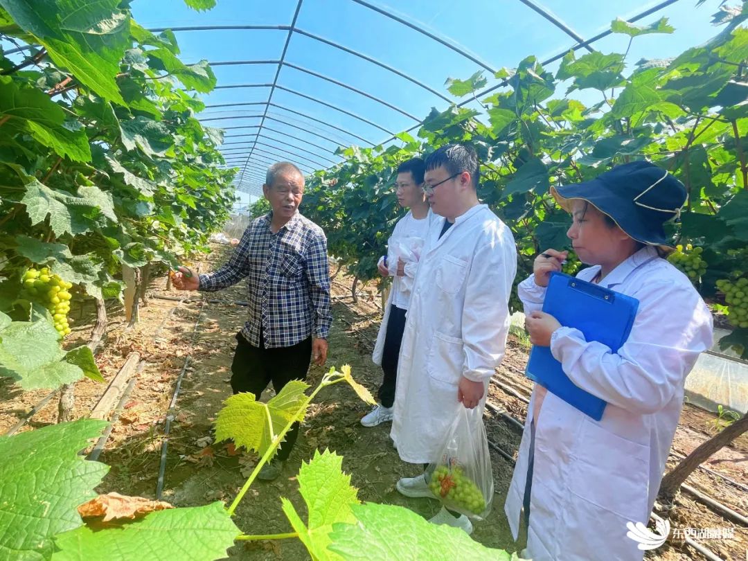 在葡萄大棚内,区公检中心检测人员首先对葡萄外观进行基本判断,优先选择即将完全成熟的葡萄进行检测,确保上市前检测报告能及时出来。