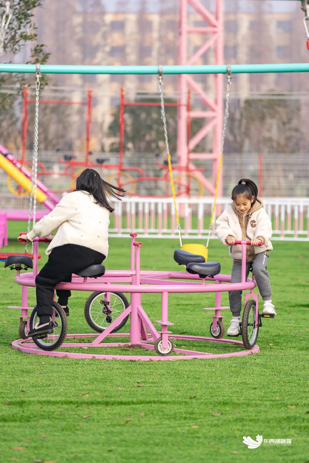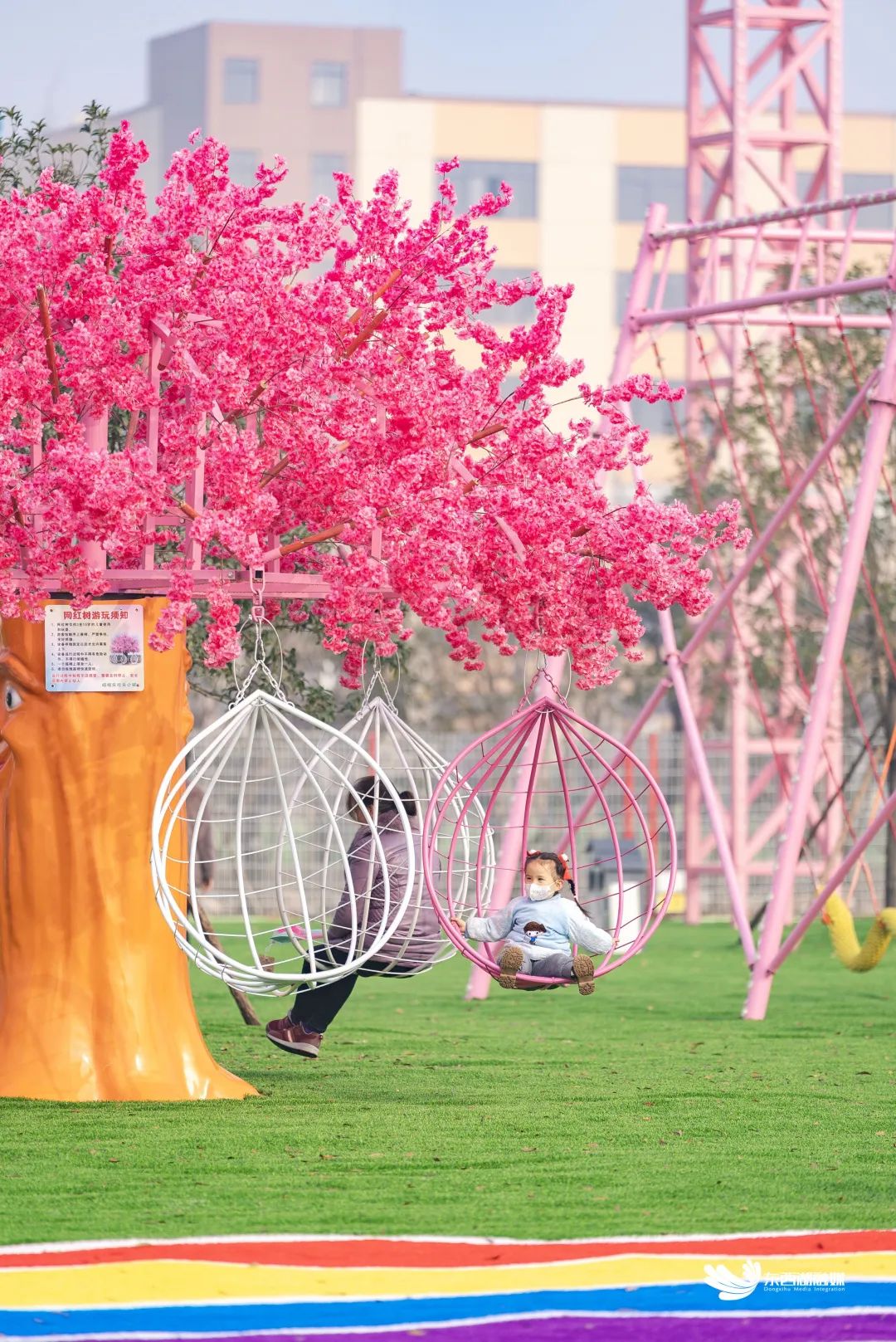 走进游乐场,色彩明艳、各具特色的无动力游玩项目映入眼帘,既有彩虹滑道、秋千、粉红沙池等游乐体验空间,也有爬网、蹦床等互动型游乐项目,还有丛林穿越、天空步道等挑战型设施。