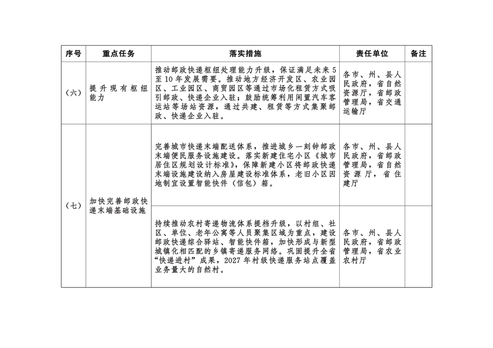 (七)加快完善邮政快递末端基础设施。完善城市快递末端配送体系,推进城乡一刻钟邮政末端便民服务设施建设。落实新建住宅小区《城市居住区规划设计标准》,保障新建小区将邮政快递末端设施建设纳入房屋建设标准体系,老旧小区因地制宜设置智能快件(信包)箱。持续推动农村寄递物流体系提档升级,以村组、社区、单位、老年公寓等人员聚集区域为重点,建设邮政快递综合驿站、智能快件箱,加快形成与新型城镇化相匹配的乡镇寄递服务网络。巩固提升全省“快递进村”成果,2027年村级快递服务站点覆盖业务量大的自然村。
