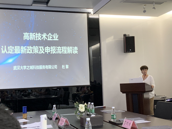 武汉大学之城科技服务有限公司政策研究室主任杜黎现场讲解了高新技术企业认定的最新政策和申报流程,分别从政策介绍、操作流程、创新能力评价、难点解答等四个方面进行了全面的解析,让参会企业负责人受益匪浅。多位参会企业负责人表示,杜黎老师的深入讲解解答了他们在申报中遇到的一些困惑。