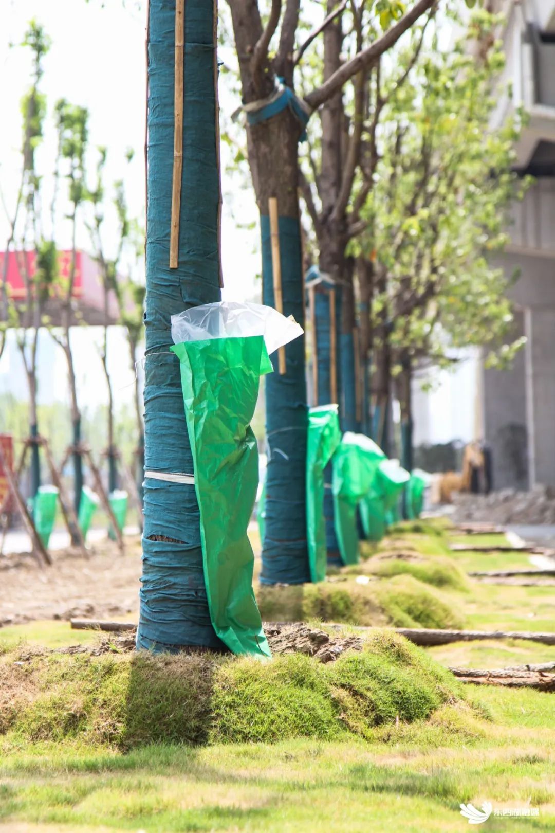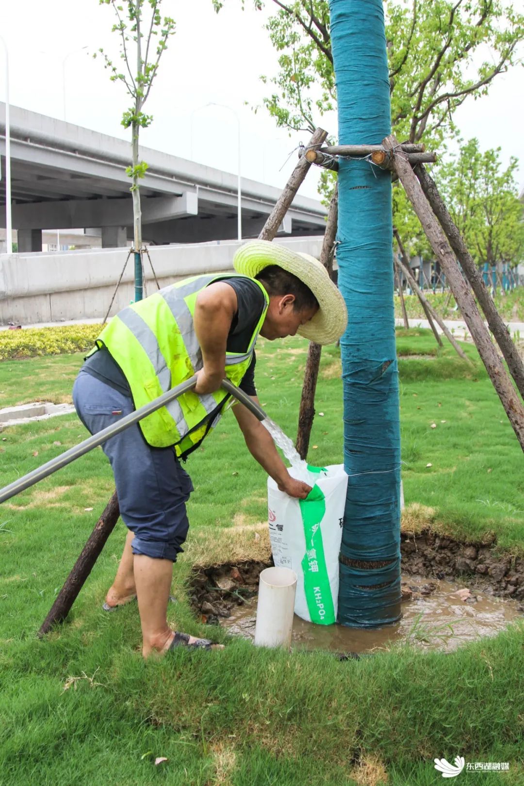 上周,记者在G107武汉市东西湖段(高桥二路至额头湾)快速化改造提升工程现场看到,在烈日的炙烤下,园林工人正给一棵棵行道树挂上水袋:先将绿色的水袋通过铁丝环绕,稳稳绑在树干上,再将水袋口撑开,底部整理平整。