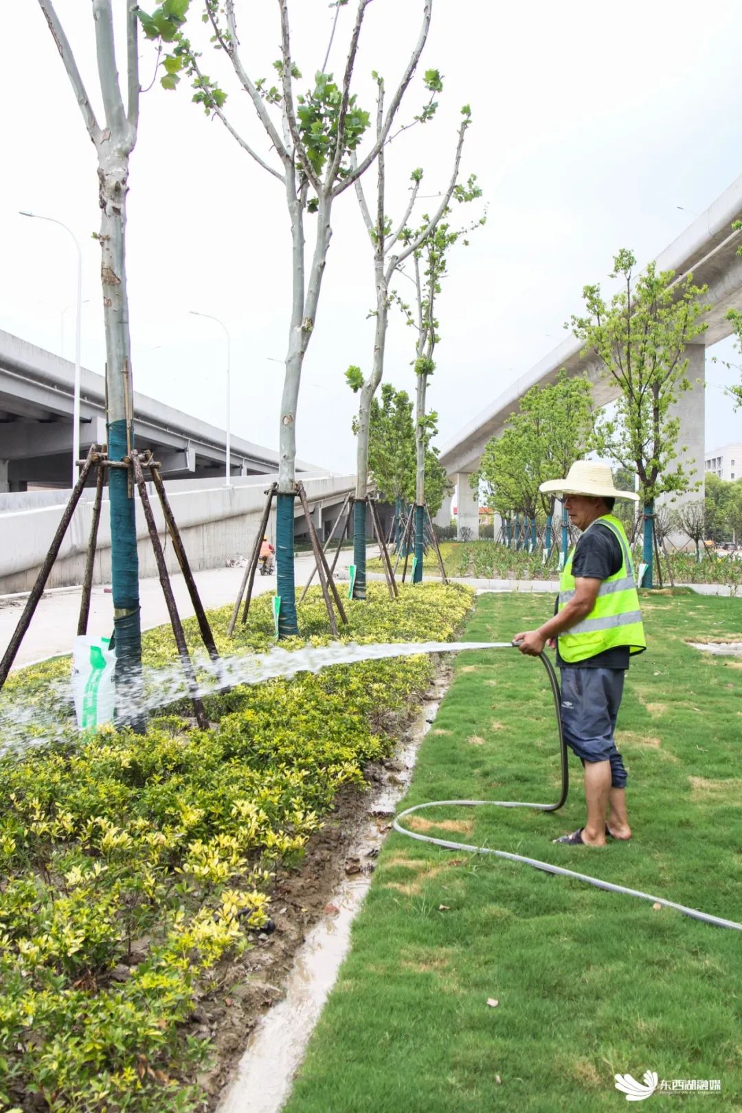 目前,每天投入水车50多台,分两组进行浇水作业,每天清晨4点至9点、下午4点至午夜12点,实行人歇、车不歇,在重点路段,还安排通宵浇水队伍守护苗木。除浇灌外,双层水袋滴灌同步发力,专人巡查,保障滴灌顺畅。