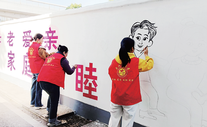 社区志愿者一起绘出文化墙。