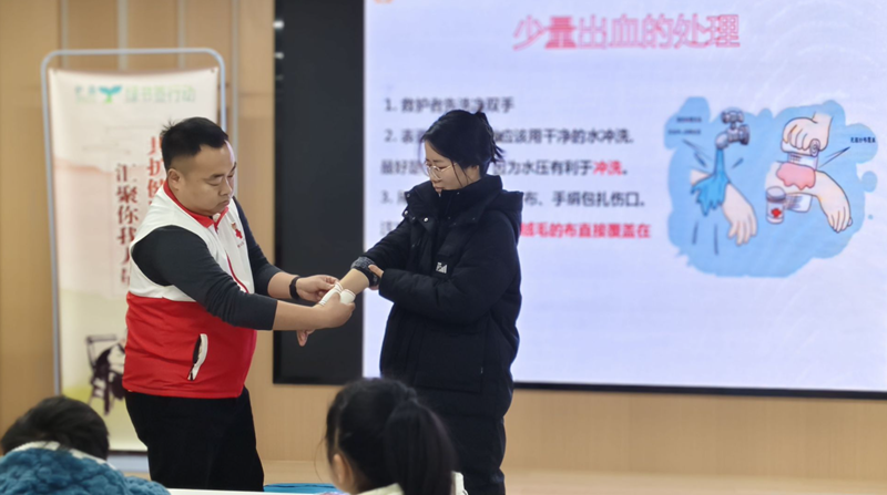 活动以一段生动有趣的急救主题动画视频拉开序幕,随后专业讲师围绕“绿书签护苗,安全不缺位”系统讲解心肺复苏(CPR)、海姆立克急救法、烫伤、猫狗咬伤、意外出血常见创伤科学处理、一氧化碳中毒预防要点等四大实用急救知识,每一项知识都紧贴青少年生活实际。为巩固学习成果,讲师抛出趣味有奖知识问答,孩子们踊跃举手抢答,在轻松愉悦的氛围中加深记忆。课程中,讲师还特别邀请家长上台配合示范海姆立克急救法及十字伤口包扎,通过现场互动让讲解更具直观性,同时向家长们发放预防一氧化碳中毒宣传折页与绿书签主题宣传资料,推动急救知识与护苗理念走进家庭。