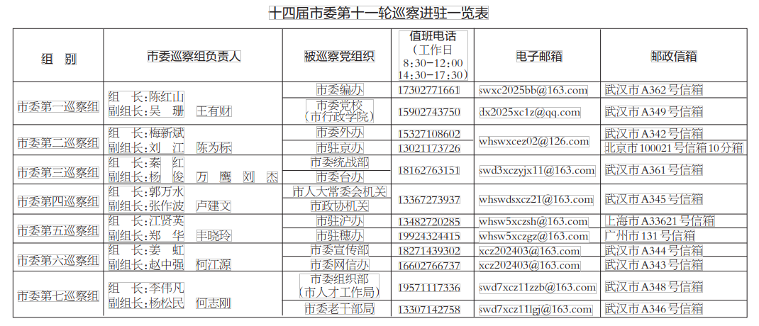 据悉,本轮巡察时间60天左右,其间设立值班电话、邮政信箱、电子邮箱、“荆楚码上巡”,主要受理反映被巡察党组织领导班子及其成员、下一级党组织主要负责人和重要岗位领导干部问题的来信来电,重点是关于违反政治纪律、组织纪律、廉洁纪律、群众纪律、工作纪律、生活纪律等方面的举报反映。