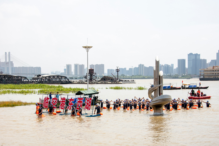 “武汉临空港,腾飞东西湖!”喊着响亮的口号,临空港方队上午10点15分在武昌汉阳门入水,到11点09分在汉口江滩三阳广场上岸,用不到一个小时的时间完成了横渡长江,69名队员全部顺利上岸。