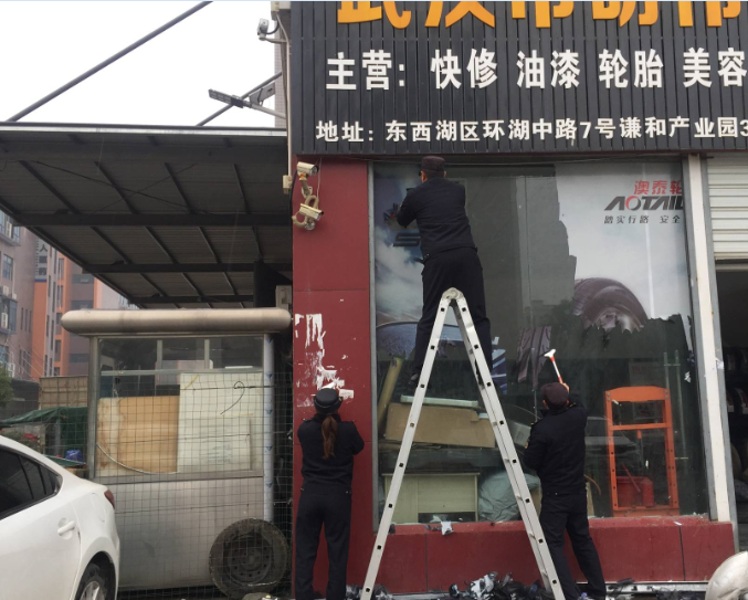 不少商户为了吸引顾客的注意力,增强宣传效果,纷纷利用贴画、裱字、涂写等方式对墙面、橱窗等面积较大、较为醒目的区域进行“过度美容”。殊不知商家贴上这一张张自认为漂亮的“脸谱”,已违反了“门前三包”责任制管理的相关规定。东西湖区金银湖街城管立面环境整治专班的队员迅速行动起来,化身“洁面师”,还居民一个洁净亮美的城市环境。