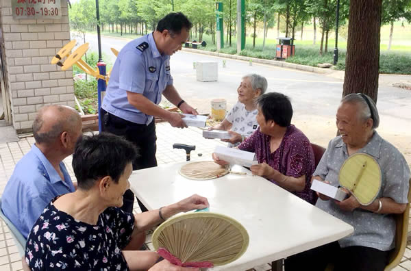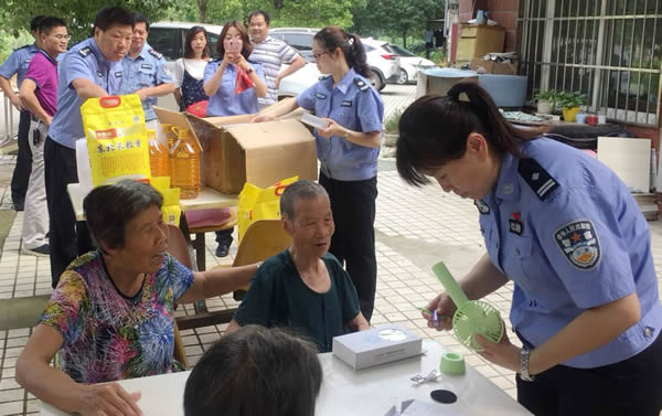 图为6月29日,武汉市公安局东西湖区分局三店派出所党员民警、辅警及“万名警察进社区”专班民警给养老院老人送来微型电扇、水果、食油、大米等物资,让老人们安全度夏。