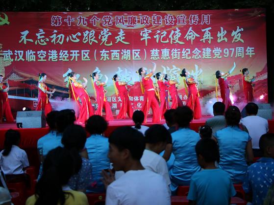 为庆祝建党97周年,倡导廉洁工作作风,丰富群众精神文化生活,近日,由慈惠街工委、八向大队党支部、街文体站联合东西湖区文化和体育局,共同承办的“不忘初心跟党走,牢记使命再出发”慈惠街庆祝建党97周年红色献礼演出在慈惠街八向大队刘家台杉树林广场举行。