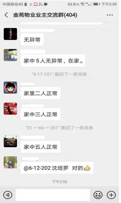在这个小区,居民每天主动微信申报有无发热。这个404人的业主群里每天自查疫情。