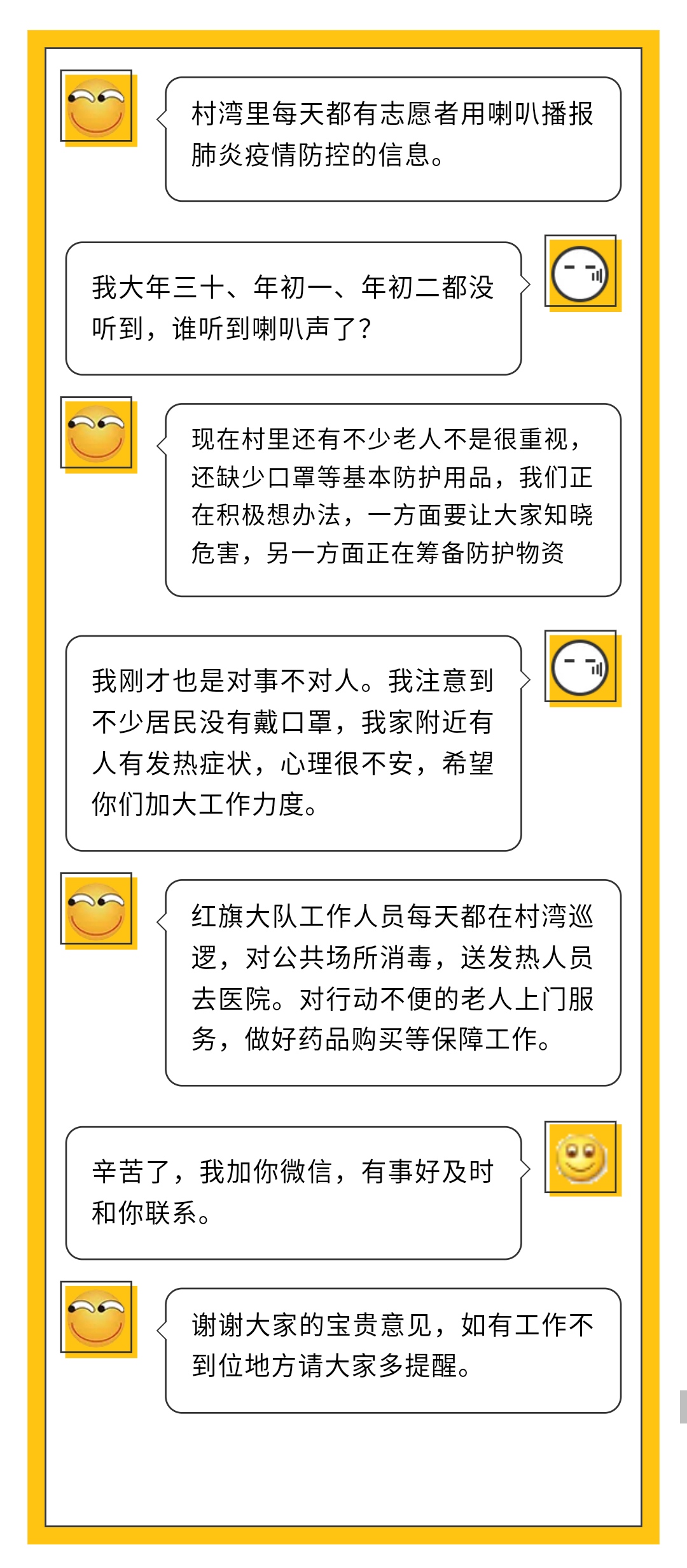 原来,1月27日下午,红旗大队在村湾广播疫情防控宣传工作,居民微信群里弹出一则“怨气”颇大的消息:“先前不广播,现在广播有什么用。”