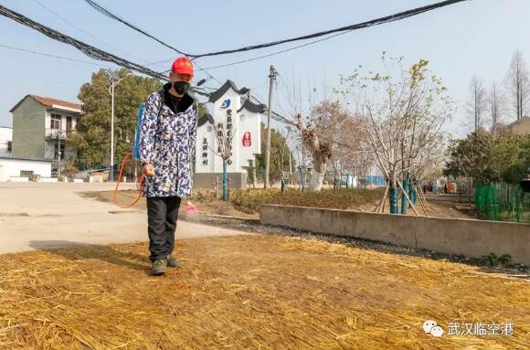 在东山街向阳大队的路口,铺上了一层草垫,工作人员对草垫进行消毒,喷洒消毒水,最大程度的隔绝病毒。