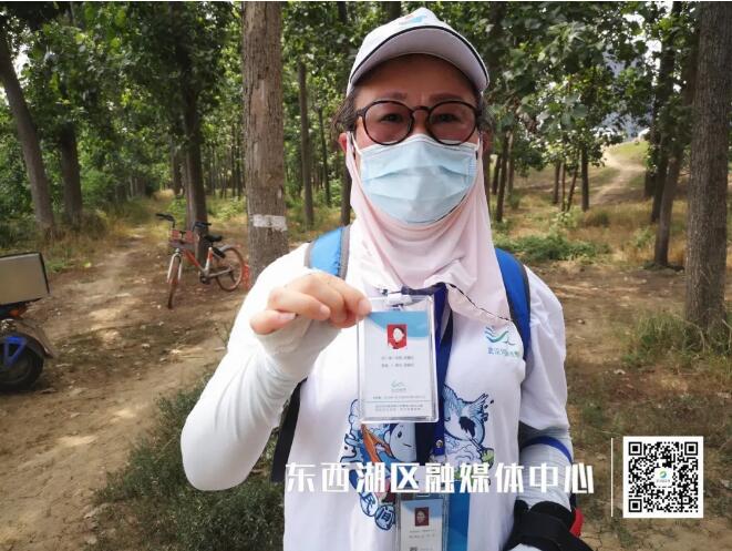 她背着河湖长的工具包,包里装有垃圾钳、手机,随时拍照,将现场情况报告给街道管控单位的官方河湖长,同时也报告给爱湖志愿者协会。