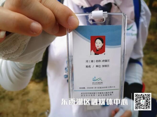 张钢兰胸前挂着3个牌子,一个是民间湖长工作证,一个是将军路中心沟工作证,还有一个府澴河工作证。她告诉记者,受聘民间河湖长已经 4 年多了,巡湖工作她一直按期进行。
