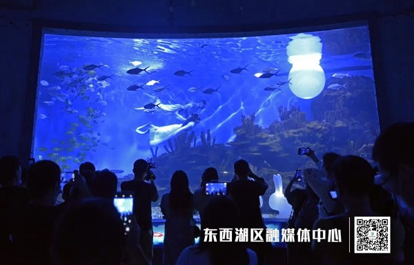国庆期间,武汉海昌极地海洋公园在蔚蓝的“海底隧道”,上演了一场场“海底嫦娥奔月”的水下表演,引发在场游客阵阵欢呼。身着翩翩白衣的“水中嫦娥”,在海底与鱼群共舞后,奔向一轮“圆月”,再现经典神话传说,为游客朋友们献上精彩表演。同时园区内最受欢迎的海洋剧场是游客的必打卡演出项目,白鲸海豚环保情景剧《极地奇缘》,颇受游客喜爱。