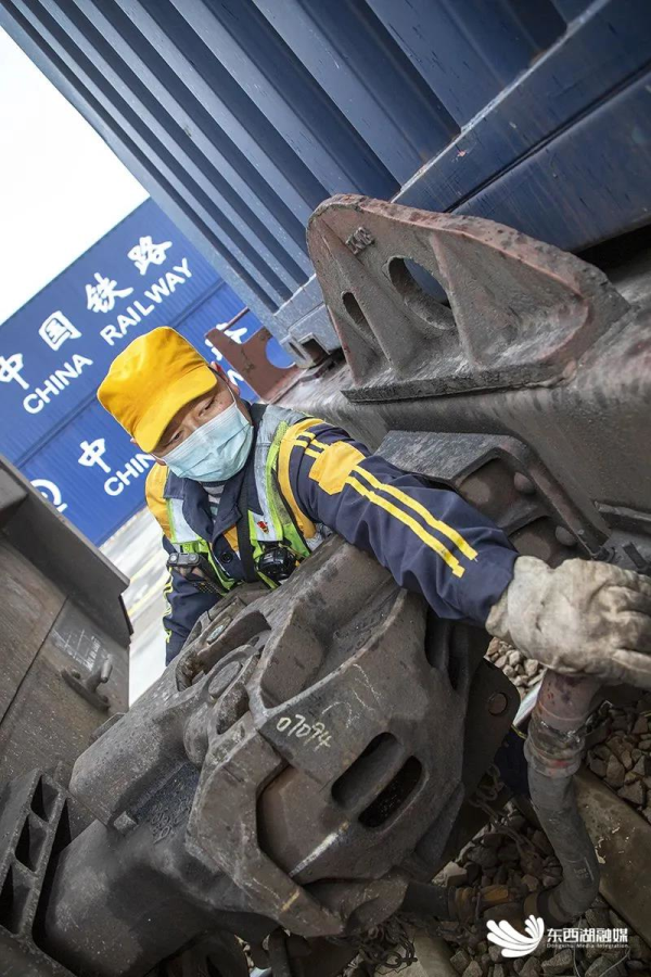 沿着列车轨道,张鹏飞从车站西头走向东头,时不时蹲下身,检查列车防溜和关门车情况,每个班次下来,平均要走上20000步。与普通货运列车相比,在吴家山车站始发的中欧班列及沿江班列,因路途远、沿途地形复杂,各项检查标准更为严格。