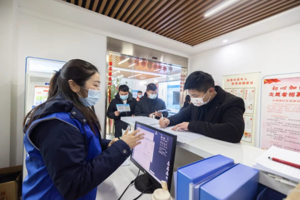 零工们在径河街长墩堤社区零工驿站里登记信息。记者 徐一帆 摄