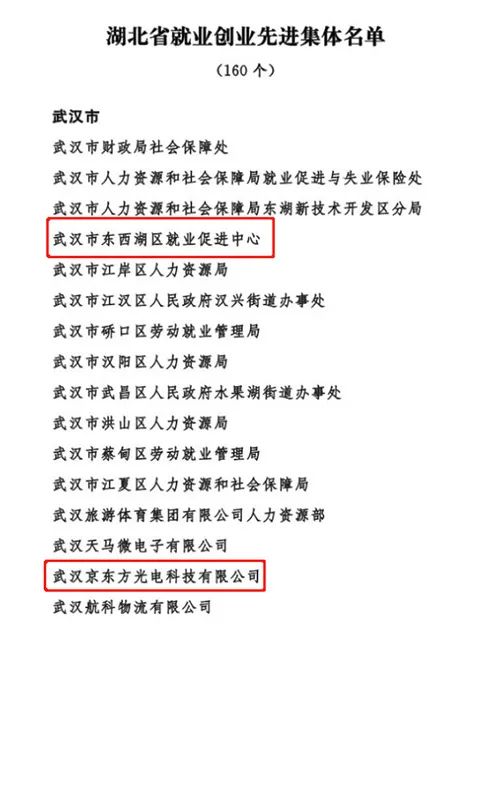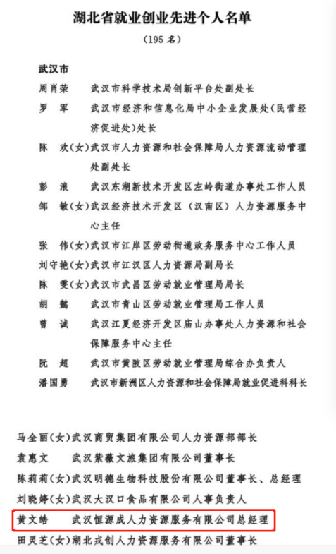 东西湖区就业促进中心、武汉京东方光电科技有限公司等两家集体,武汉恒源成人力资源服务有限公司总经理黄文皓榜上有名。