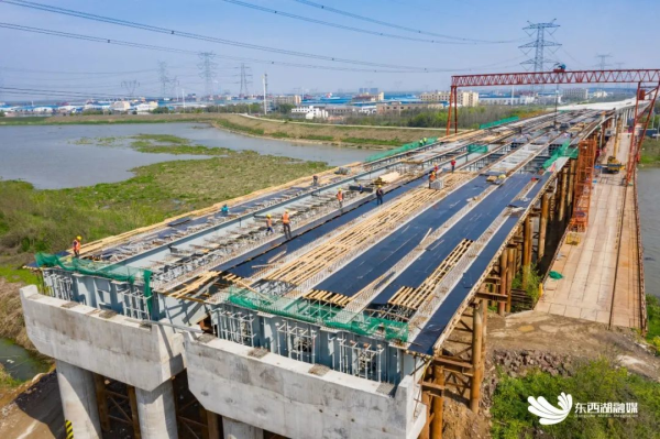 “这里正在进行挂篮施工。”在硚孝高速二期府河大桥段第37联施工点看到,30多名工人正热火朝天地投入浇筑施工,建设方湖北硚孝高速公路管理有限公司二期分公司副总经理、总工程师李勇介绍,为尽早与已通车的一期连通,施工方倒排工期,以两周为单位安排施工进度。“所有挂篮点位24小时施工,为的就是紧紧抓住雨季、汛前施工黄金期。”