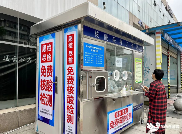 “坐在里面采样,舒适更安全!”5月11日,中百百货吴家山购物中心门口便民核酸采样小屋前,医护人员正为居民张女士进行核酸检测。扫码、采集、消毒,完成整个流程,前后不过20秒。