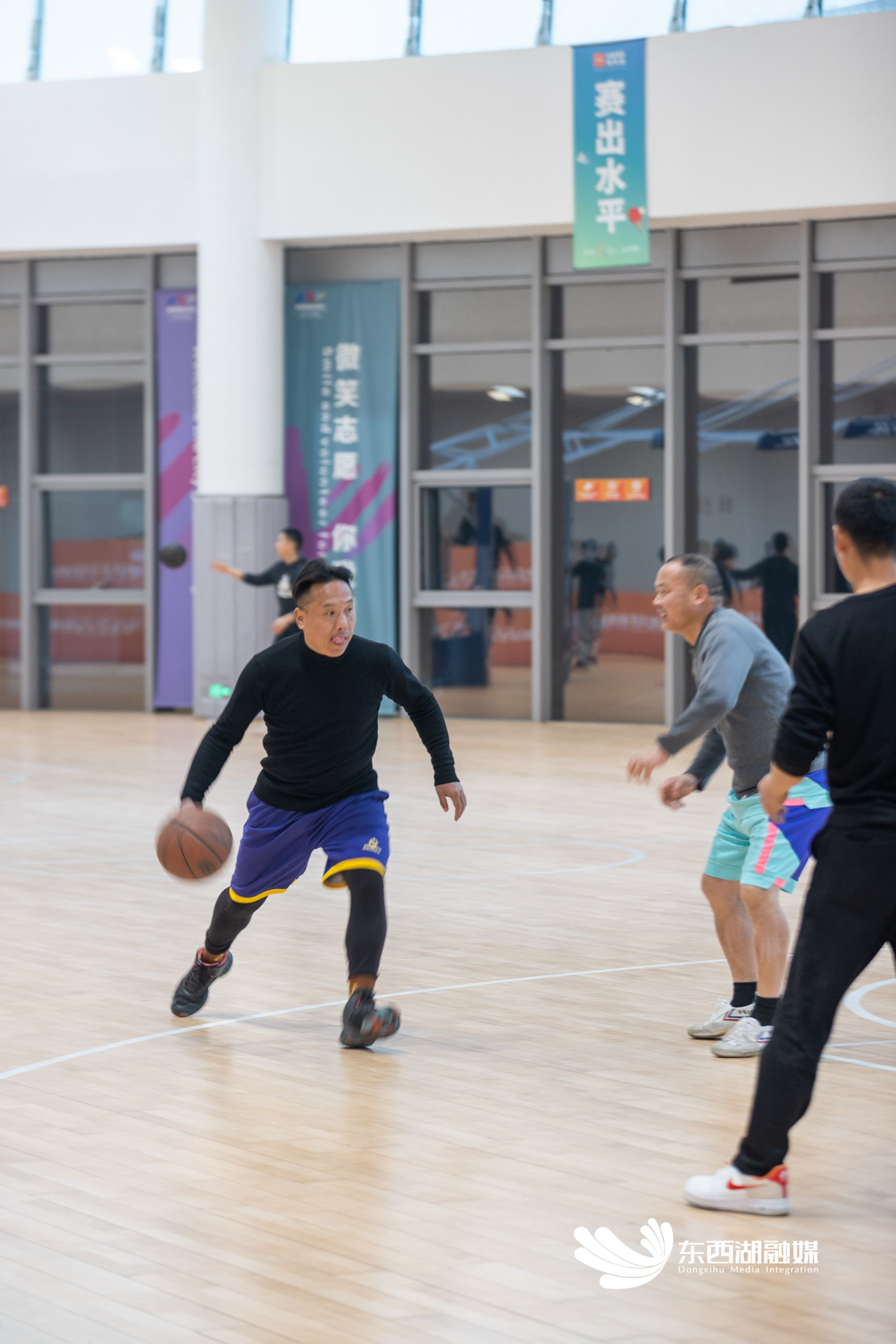 在梧桐雨体育中心的网球馆内,只见几位市民挥拍、运球,打的相当默契,网球馆包含4片标准网球场,以滑轨布帘形式灵活分隔,满足不同网球运动的空间与运动需求。