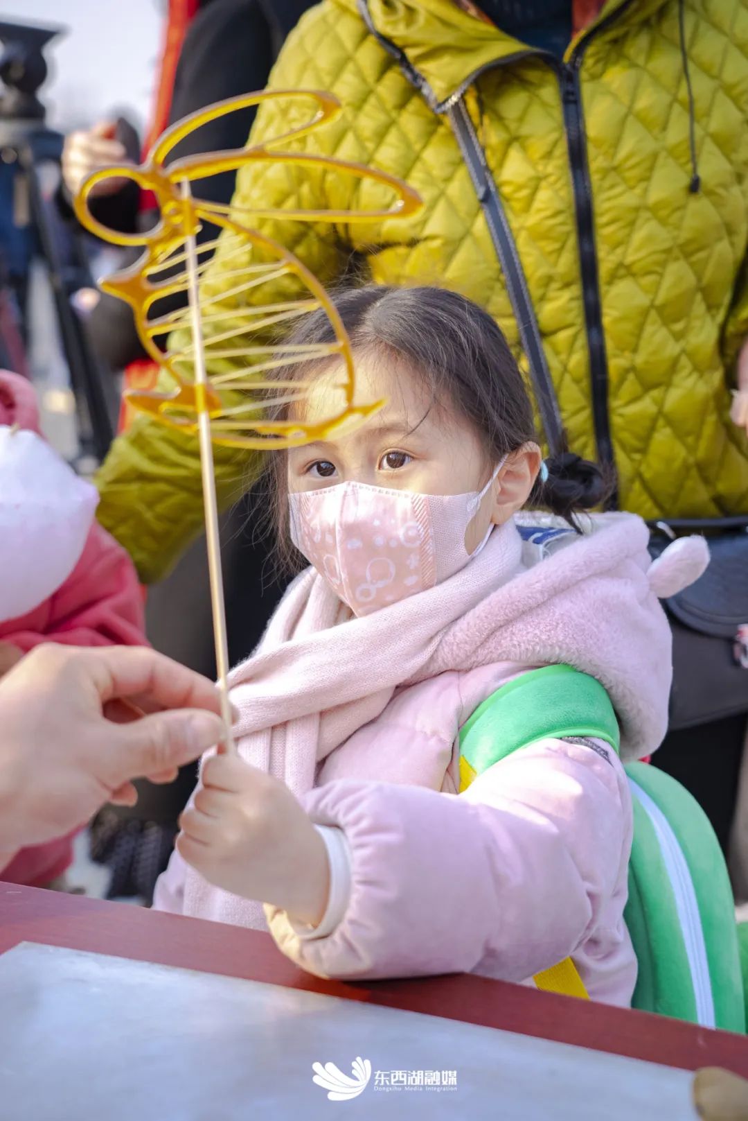 糖画展台持续“爆火”,从事糖画制作40余年的王元清被里三层外三层的团团围住,小朋友叽叽喳喳转动指针,就能得到一个相应图案的糖画。