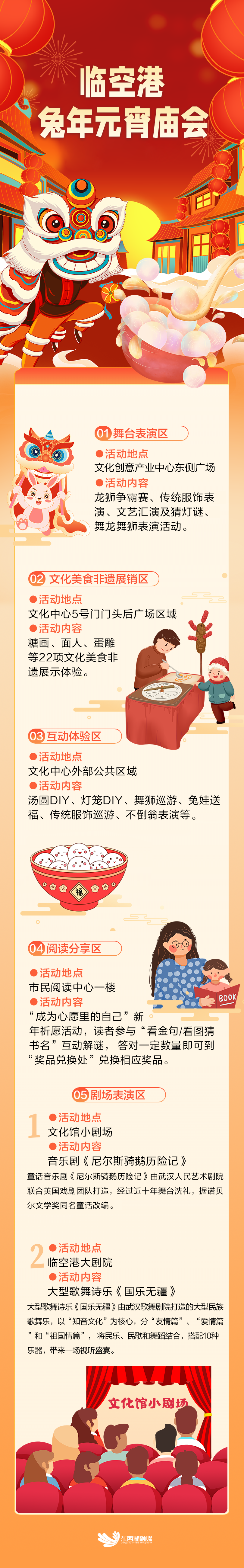文化美食非遗展示体验、新年祈愿、汉服表演、猜灯谜、舞龙舞狮表演、儿童剧《尼尔斯骑鹅历险记》等活动贯穿全天。
