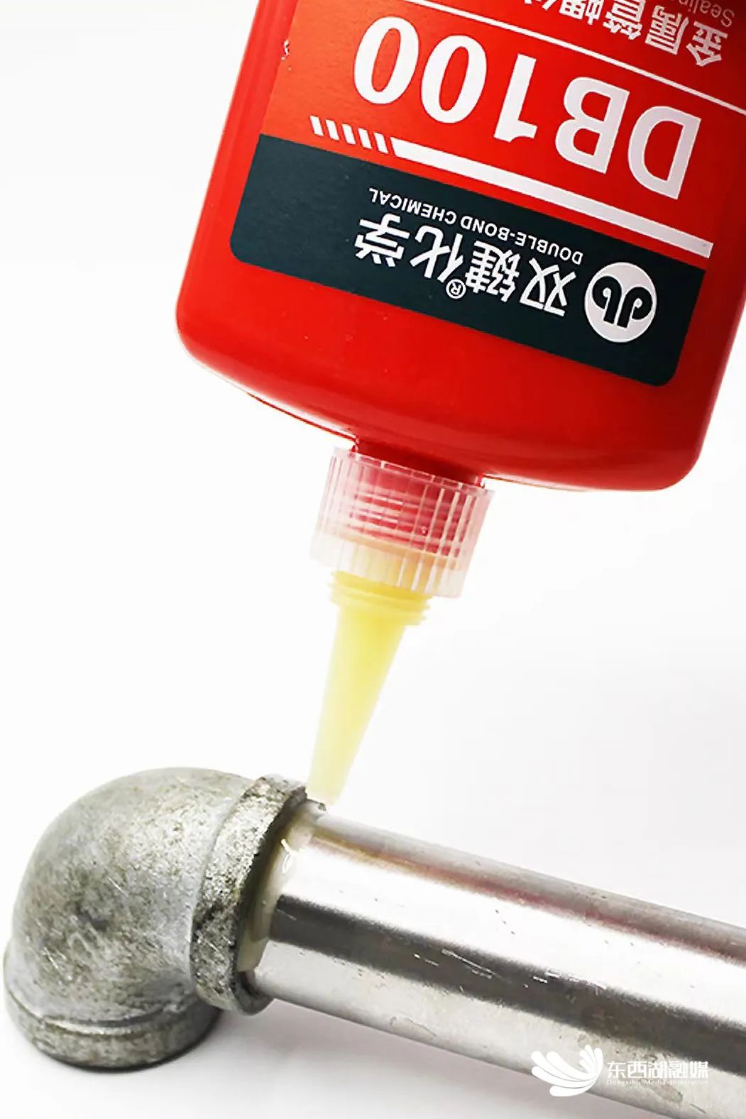 拧开盖子,挤出胶液,在管口的螺纹上涂上一圈,然后拿起另一节管道,管口相对,装配拧紧,不到一分钟,金属管件便粘合完成了。如此高效快速的秘诀,就是这支液态生料带。(化学名称:厌氧型丙烯酸酯螺纹锁固胶,简称厌氧胶)
