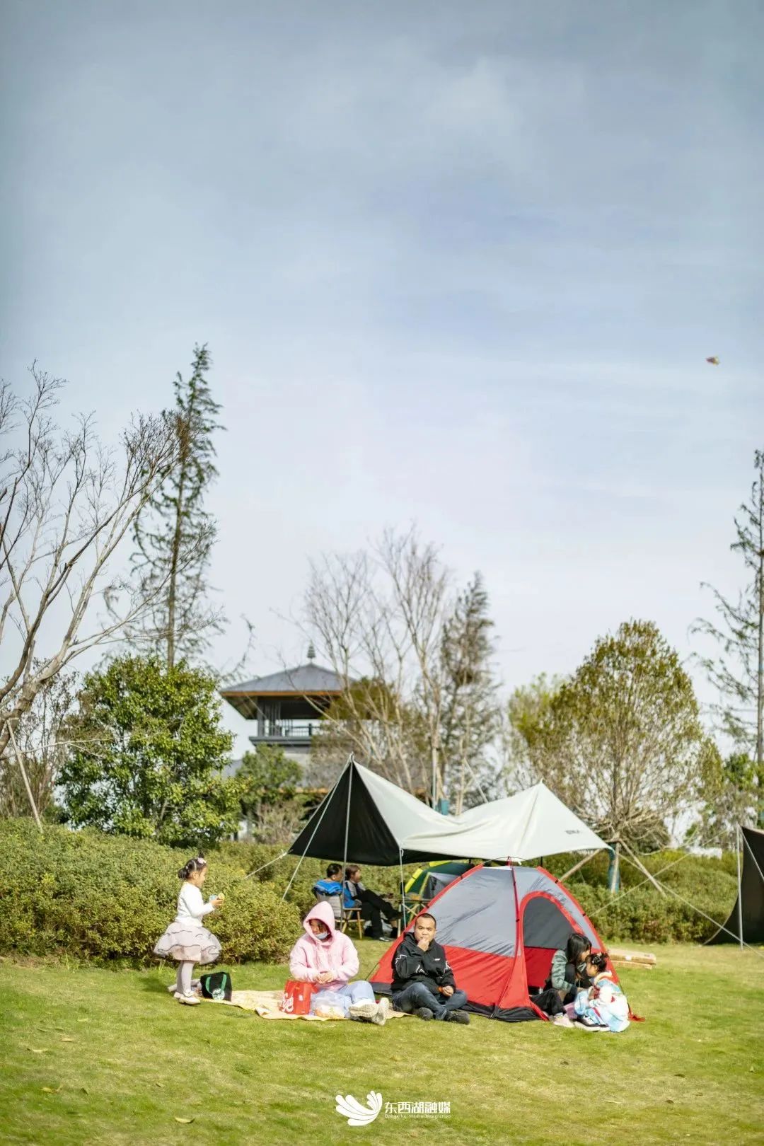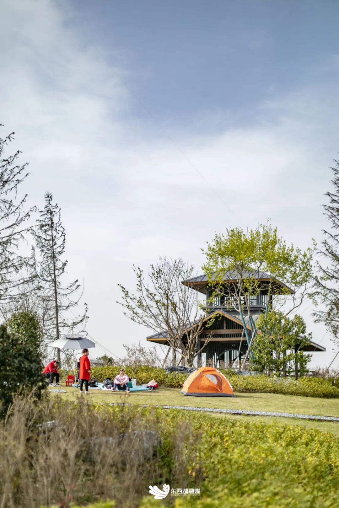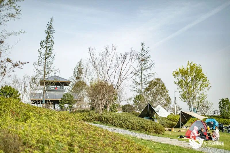 在幺教湖北岸,有大片的临湖草坪。天然的绿草地上,一个个小帐篷拔地而起,就像一朵朵刚冒出头的彩色“蘑菇”,铺一块格子桌布,摆好精心准备的餐食,打开蓝牙音响,放首舒缓的音乐,与朋友拍个vlog,在阳光下聊天开怀大笑……春天的故事也就这样开始了。
