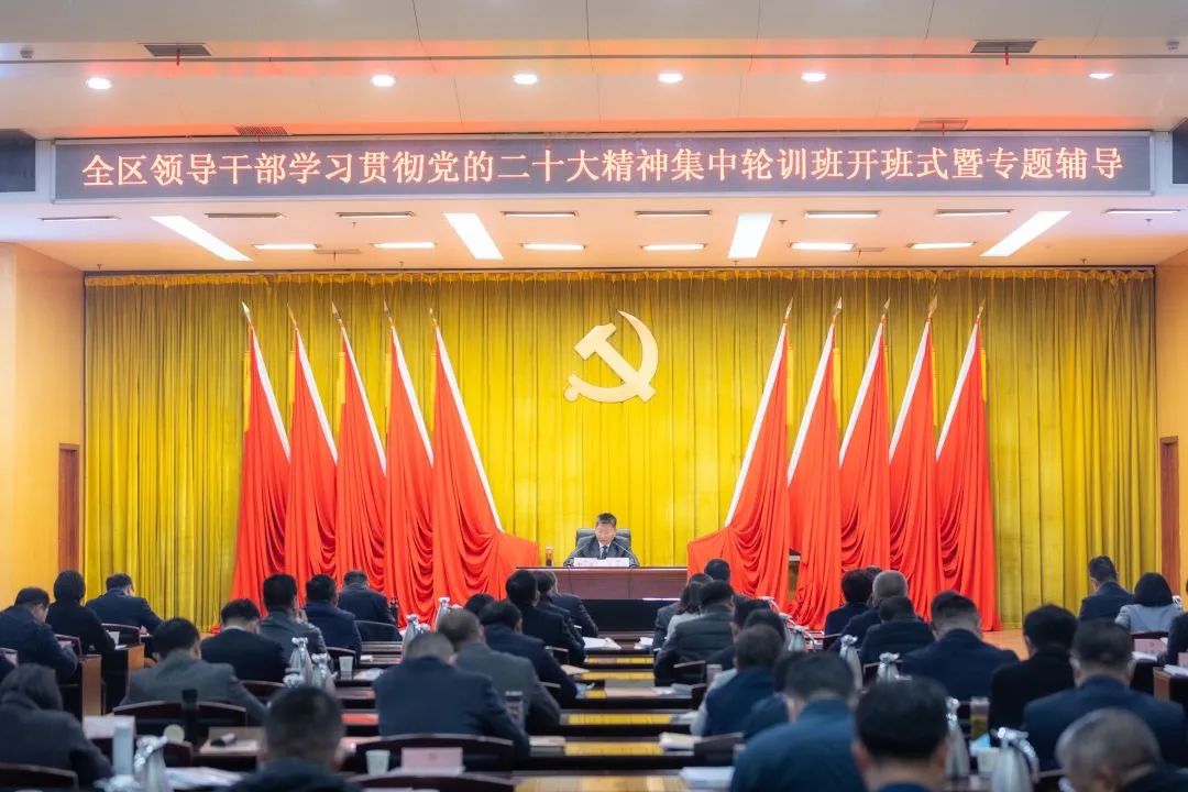 全区领导干部学习贯彻党的二十大精神集中轮训班开班式暨专题辅导会举行。区委书记彭涛出席开班式并作专题辅导报告。他强调,要紧密团结在以习近平同志为核心的党中央周围,更加全面准确学习领会党的二十大精神,坚定不移贯彻落实习近平总书记和党中央决策部署,群策群力、苦干实干,努力打造“中国网谷”,为全市打造新时代英雄城市贡献力量。