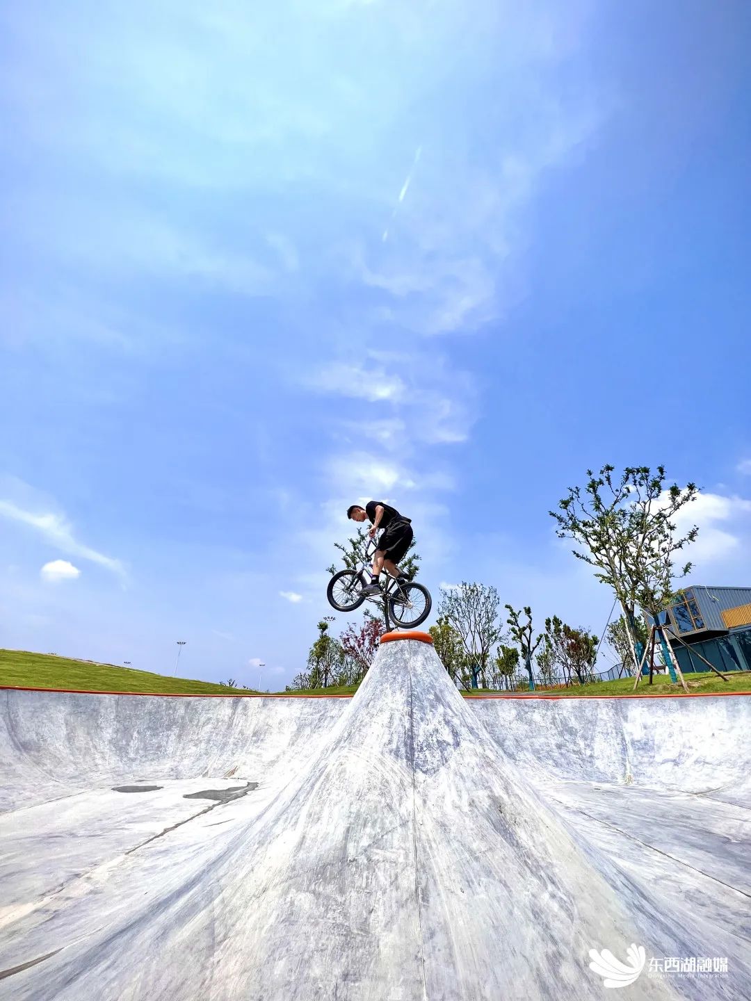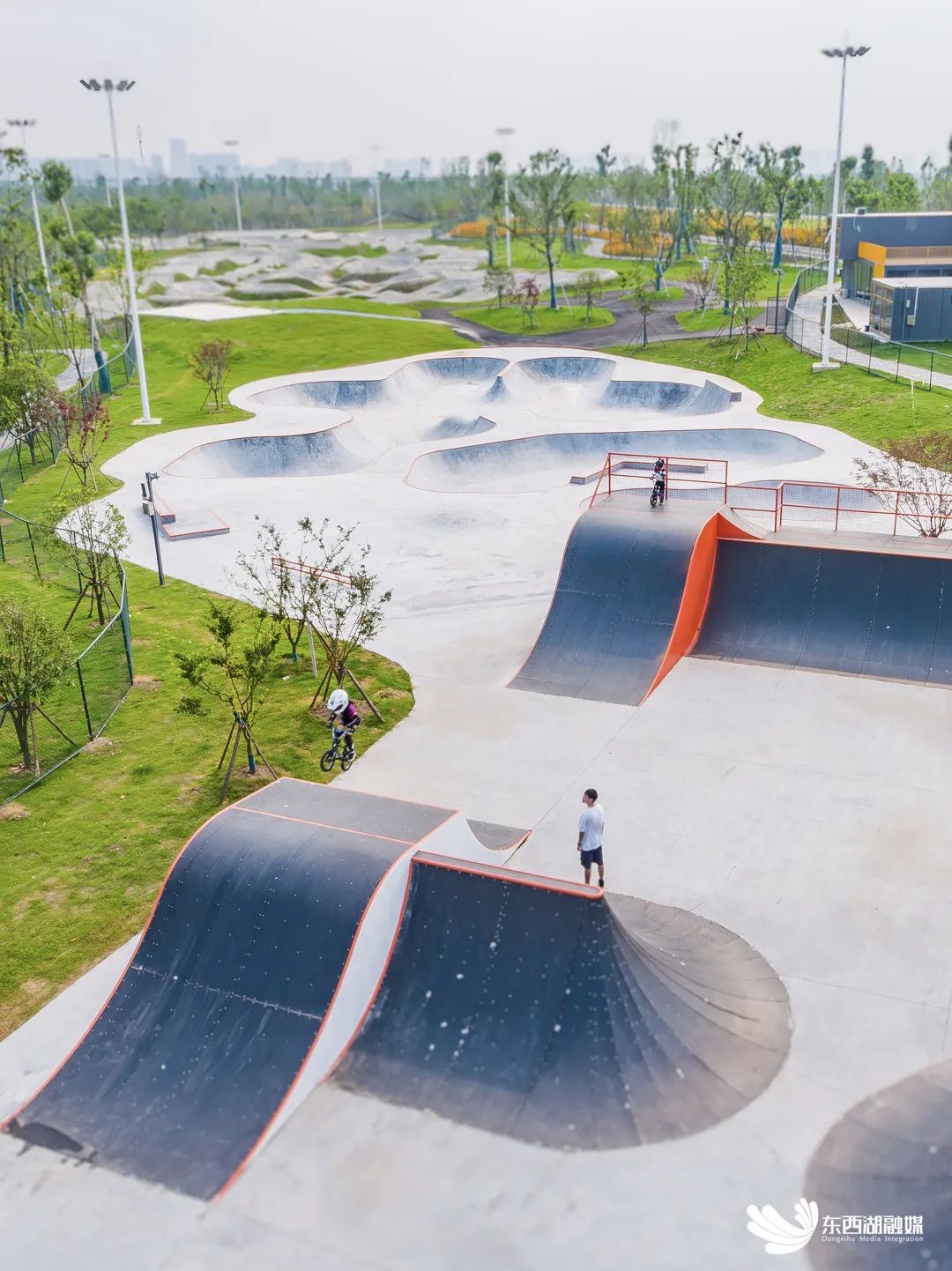 站在府河东西湖大堤上,可见一座波浪起伏的赛道延伸至树林中,这是亚洲最大的极限泵道,占地面积46000平米,包含板场、碗池、沥青泵道、XC越野等多种形式极限运动场地,这是千年府河活力再现的最新注脚。