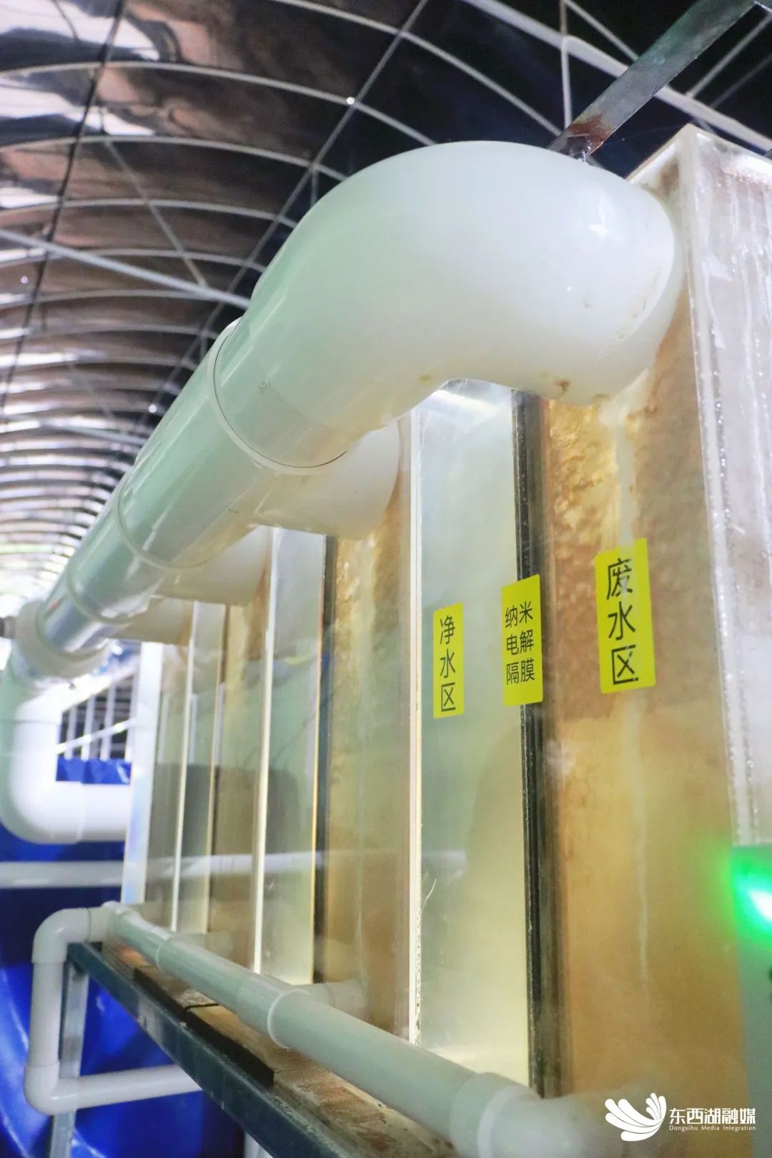 所有的圆桶都通过一条管道进行连接,在管道的源头是一个长方形的过水池,水体通过一个透明水箱过滤后,又再次回到圆桶,透明箱子内安装的组件正是隔膜电解水处理系统的核心部分:惰性金属电极和纳米隔膜,其中纳米隔膜为该团队自主研发。