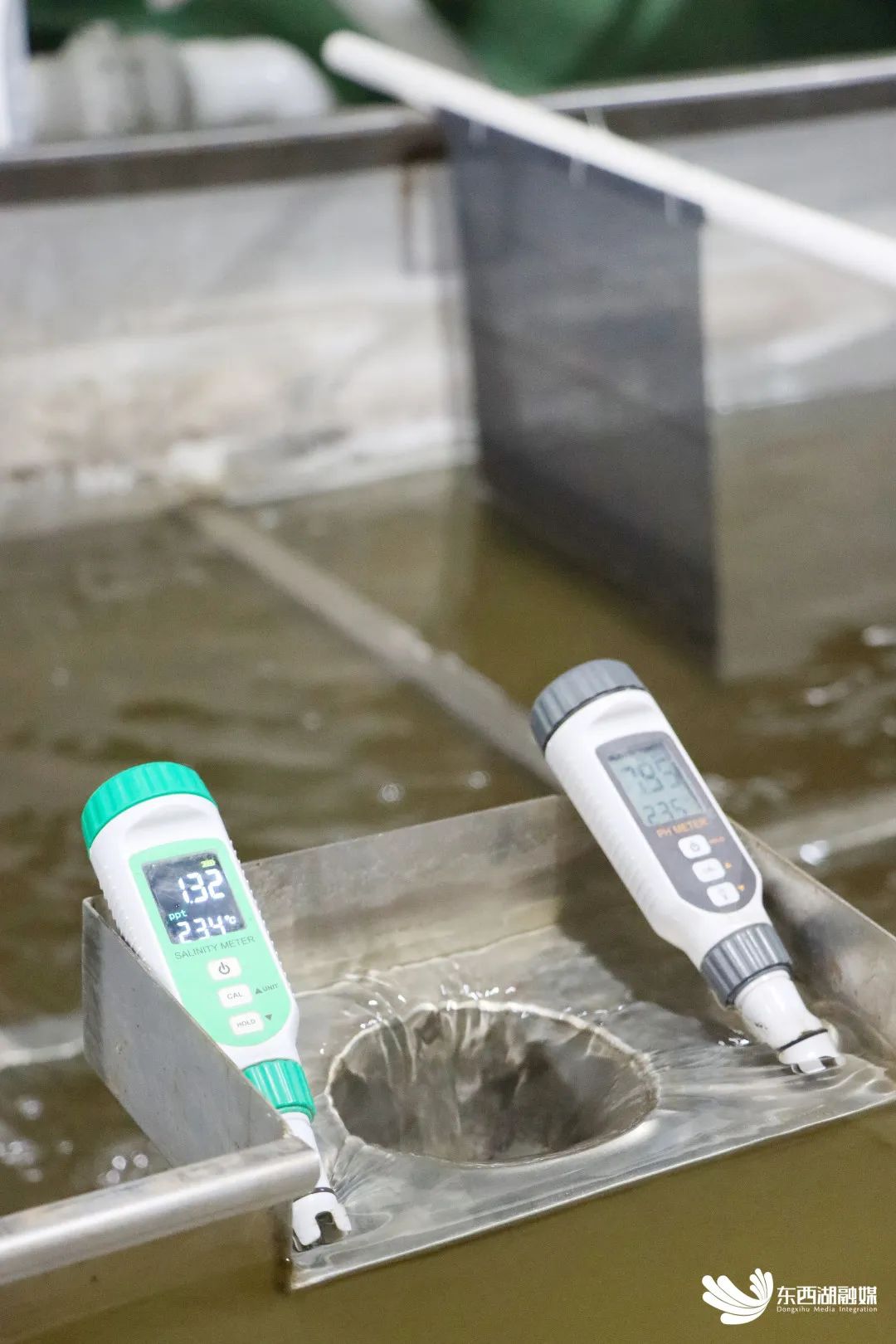 TDS检测笔(左)测量水中溶解性固体总量,pH计(右)测量水体的酸碱度值。