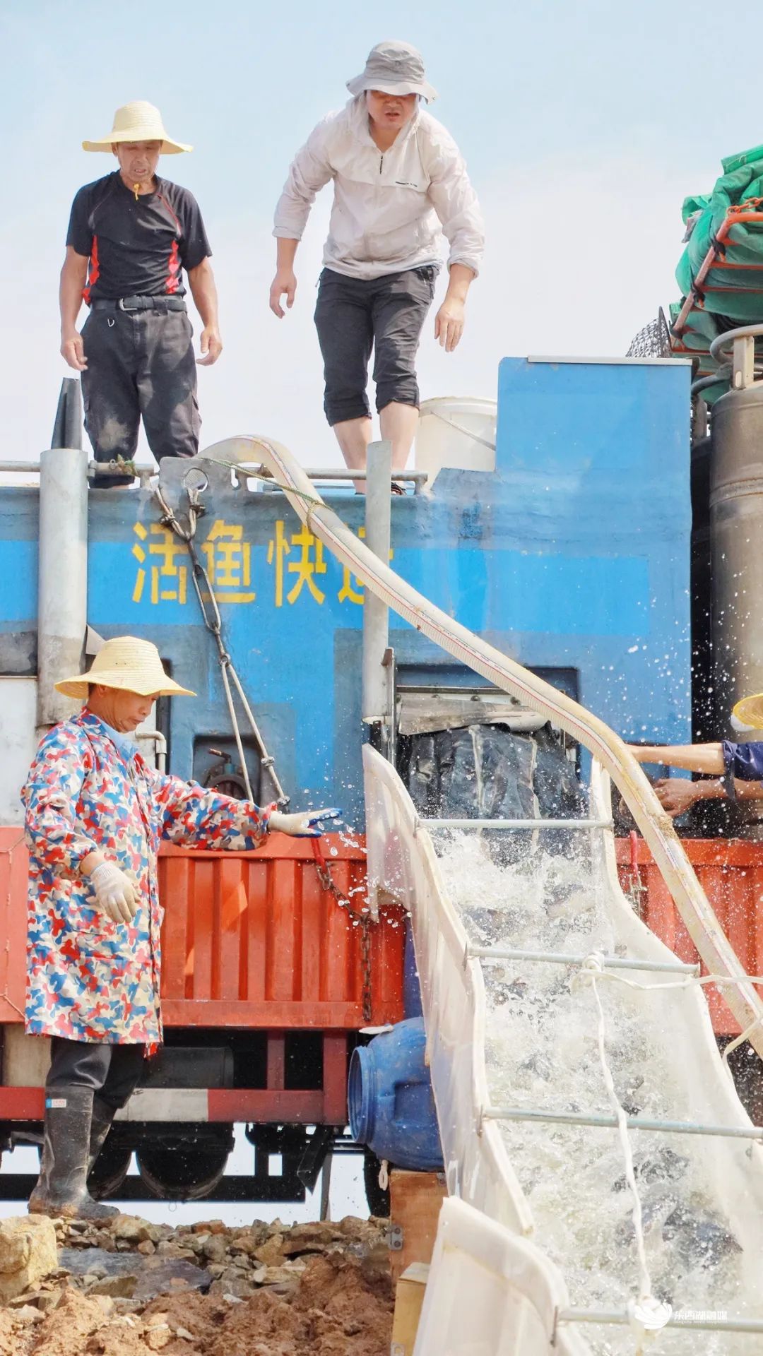 近日,记者在东西湖万亩现代渔业保供基地看到,一台装载有保温鱼箱的活鱼运输车停放在一处70亩鱼塘前,工作人员正在对箱内的活鱼进行捞网称重,完成称重确认后,活鱼又被放入箱内,随后工作人员打开鱼箱右边的“小门”,放出管道连接铺设在鱼塘前的“滑滑梯”,随着工作人员打开鱼箱最后一道闸门,瞬间无数条小鱼乘坐“滑滑梯”直达鱼塘。