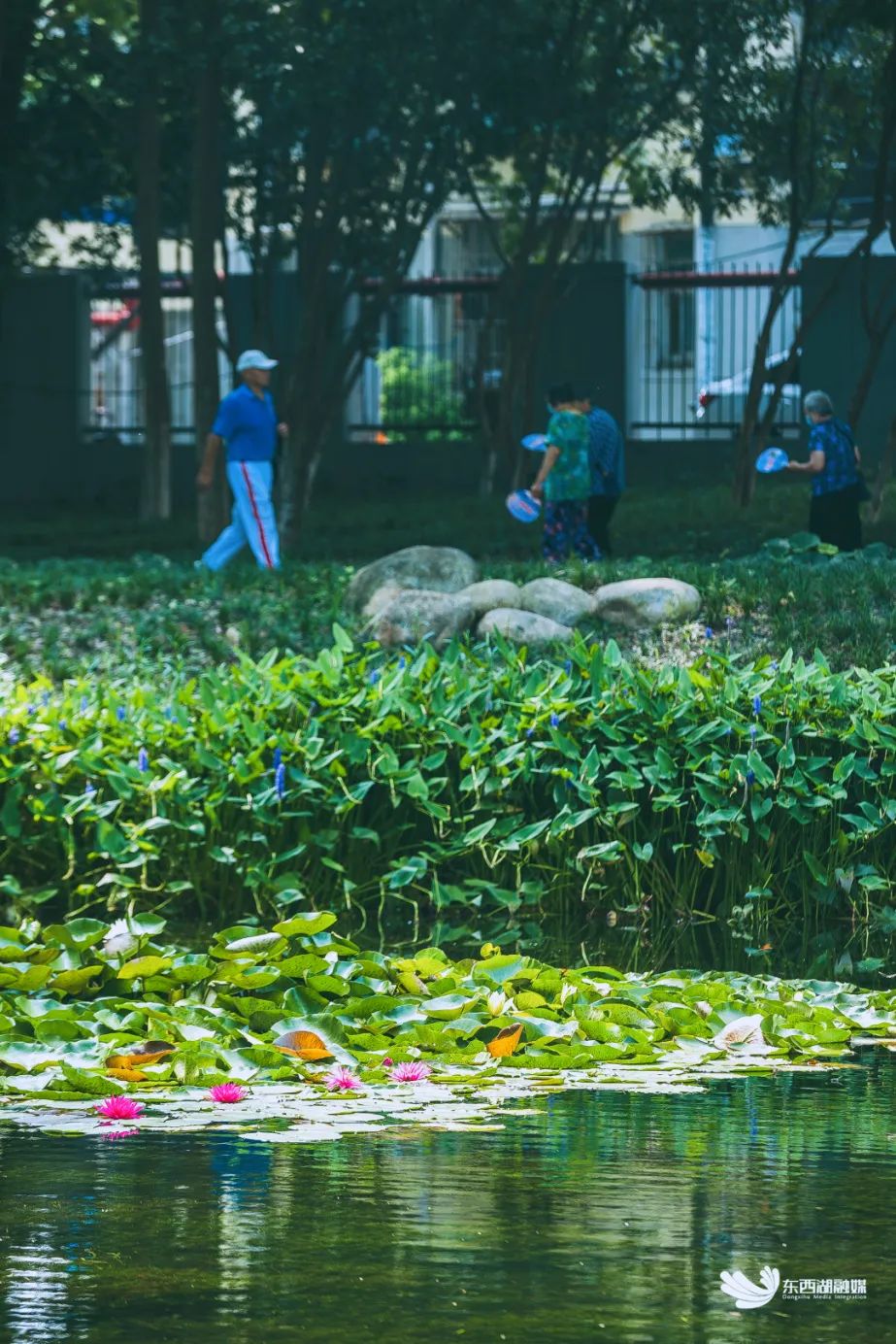 树木葱茏,环境宜人,在园内玩耍的孩子们,笑声爽朗悦耳。湖里的睡莲、菖蒲生机盎然,紫色花朵娇艳欲滴。岸边的粉色钻石月季,簇拥盛放,精巧别致。10时许,跳广场舞的阿姨们陆续归家,在树荫下闲坐聊天的老人们,继续享受着清凉……