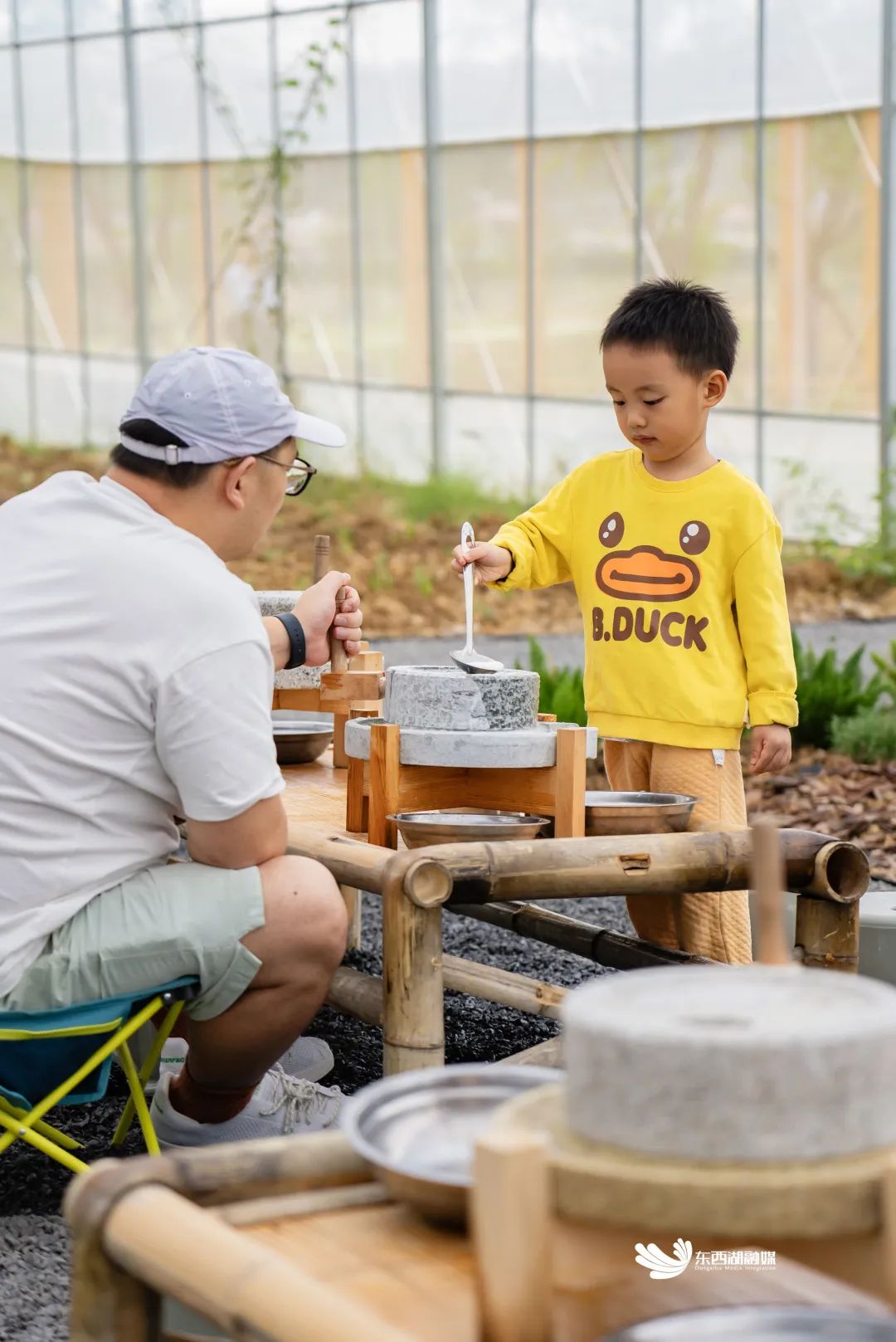 朴门农耕区域,工作人员边讲解,边指导孩子们动手制作豆浆和豆腐。只见小朋友各站在石磨前,舀豆、推磨、打浆,经过大力挤压、蒸煮等一番程序后,换来了甘甜的豆浆和美味的豆腐。