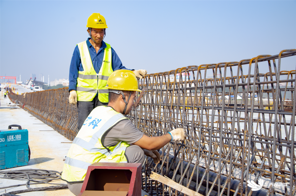 记者在四环线互通立交施工段看到,四层立交已呈现巨龙盘旋走势,冲向蓝天,施工人员正在进行四环线互通匝道施工。二标段建设方中建三局集团有限公司近400名工作人员昼夜奋战,全力冲刺今年底主线桥贯通目标。