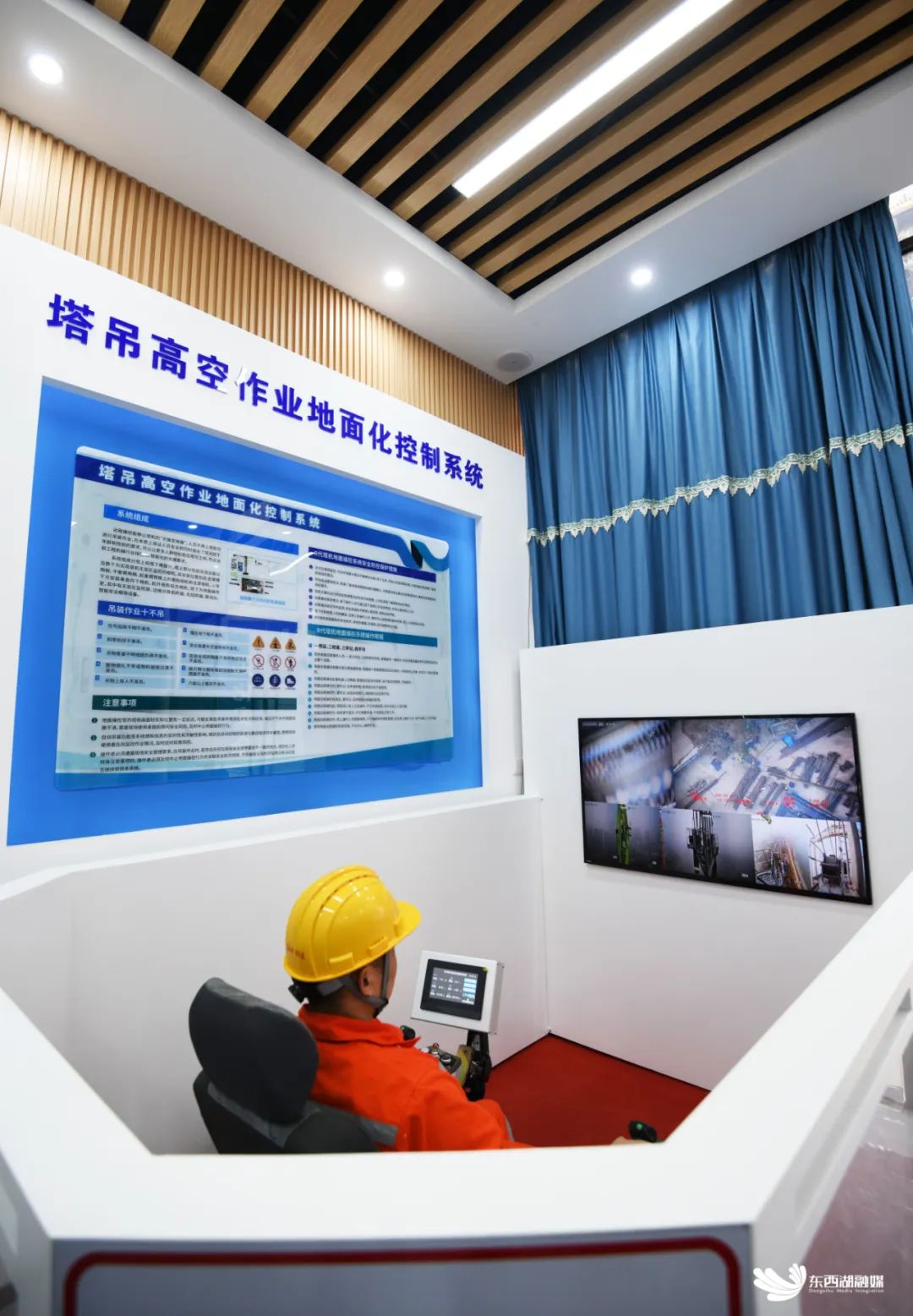 汉江特大桥智慧指挥中心,工人通过地面控制系统控制塔吊作业。