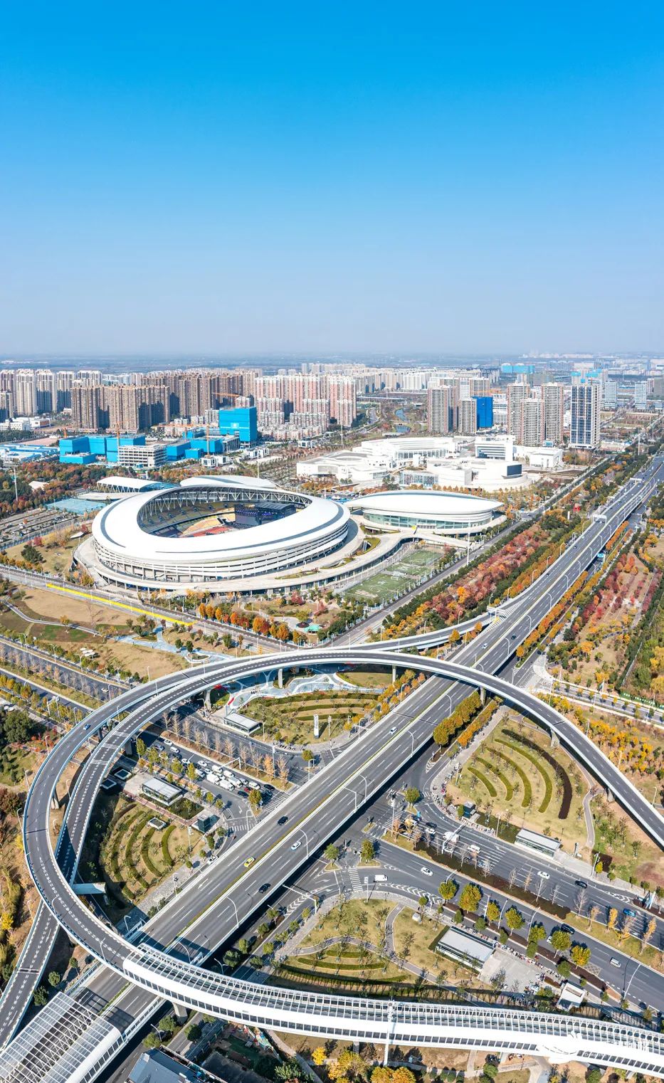 临空港大道五环立交旁,武汉五环体育中心、临空港文化中心、临空港创新中心(在建)呈品字型分布。
