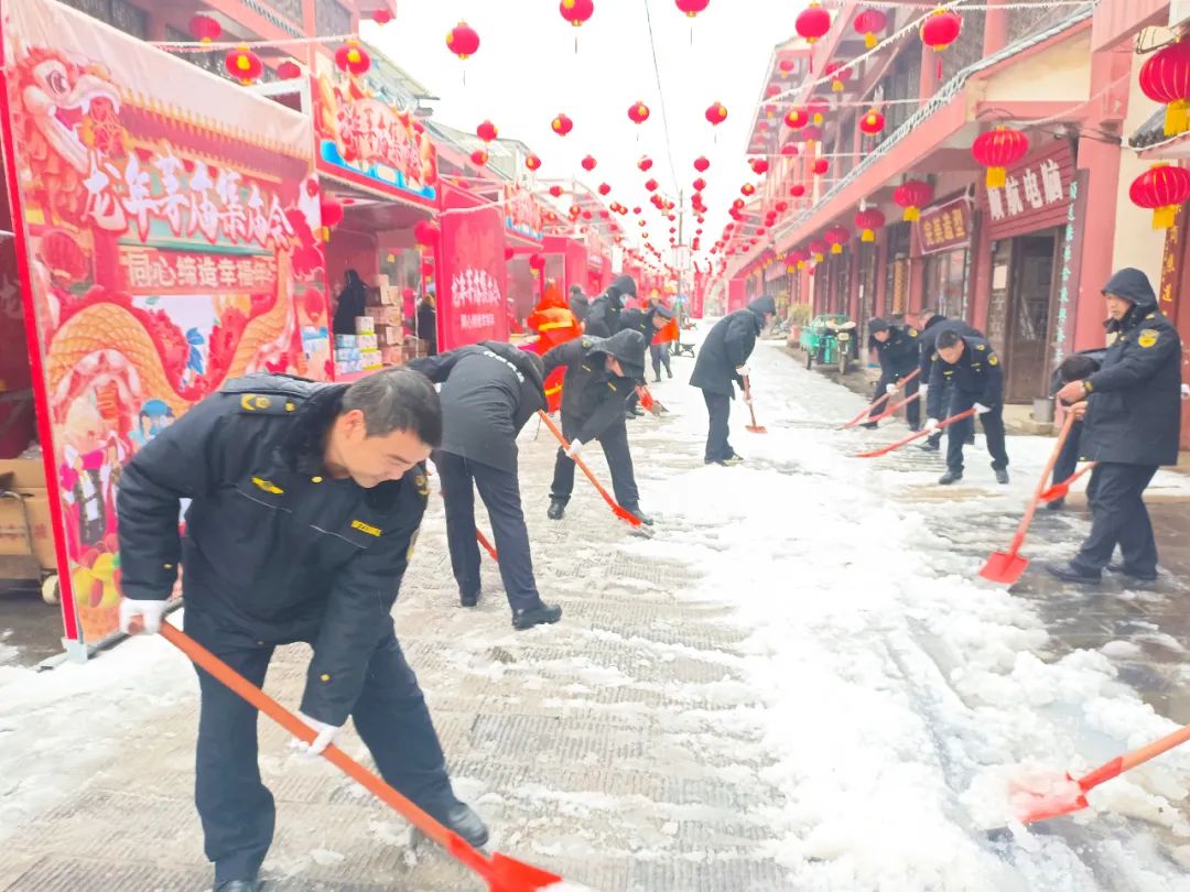柏泉街道综合执法中心队员正对茅庙集庙会区域商业街铲雪,保障畅通。(通讯员供图)