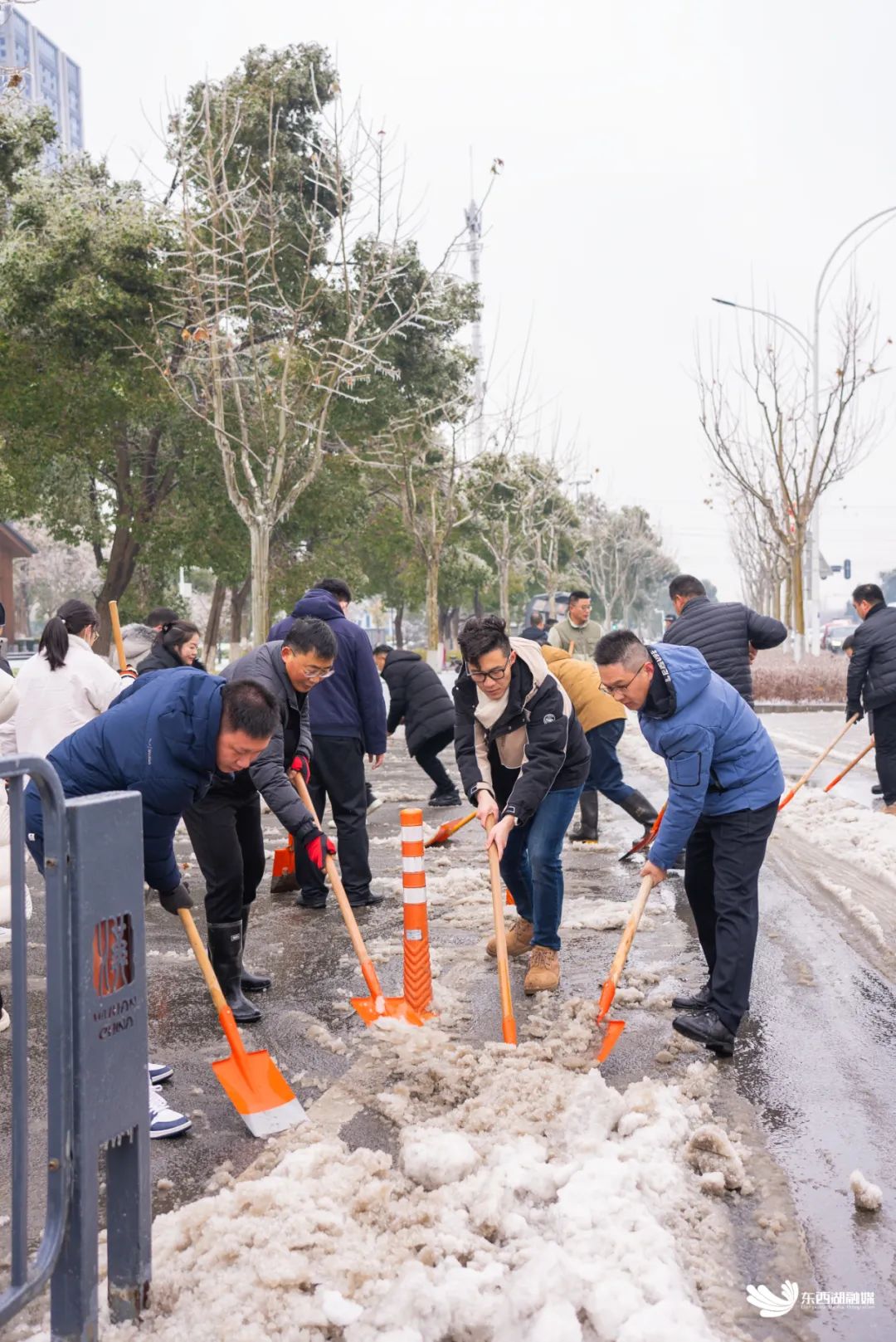 区城管部门结合路面积雪情况和交通实际情况,按照“先重点、后一般,先主干、后次巷”的原则,快速集结雪滚车、铲车、撒布车等大型除雪机械,上足除雪人员,在辖区金山大道、临空港大道、东吴大道、九通路、惠安大道等重点道路以及桥梁、地铁口、广场周边等车辆行人密集点位,强化巡查督导,加大除雪铲雪力量,科学高效融雪铲雪除冰,全力做好融雪保障工作。