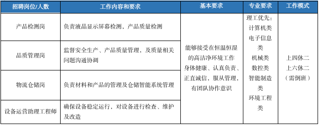 据了解,本次招聘产品检测岗、品质管理岗、物流仓储岗、设备运营助理工程师4个岗位。薪资待遇可根据每年职级和绩效进行调整。除根据国家标准上缴五险一金外,另外提供商业保险、企业年金。食堂餐食种类丰富,煲仔饭、麻辣烫应有尽有。公司拥有完善的职工生活区,配有超市、食堂、篮球场、足球场、羽毛球场、台球室、乒乓球室、健身房、咖啡厅、轰趴馆、KTV、网球场等员工活动设施。