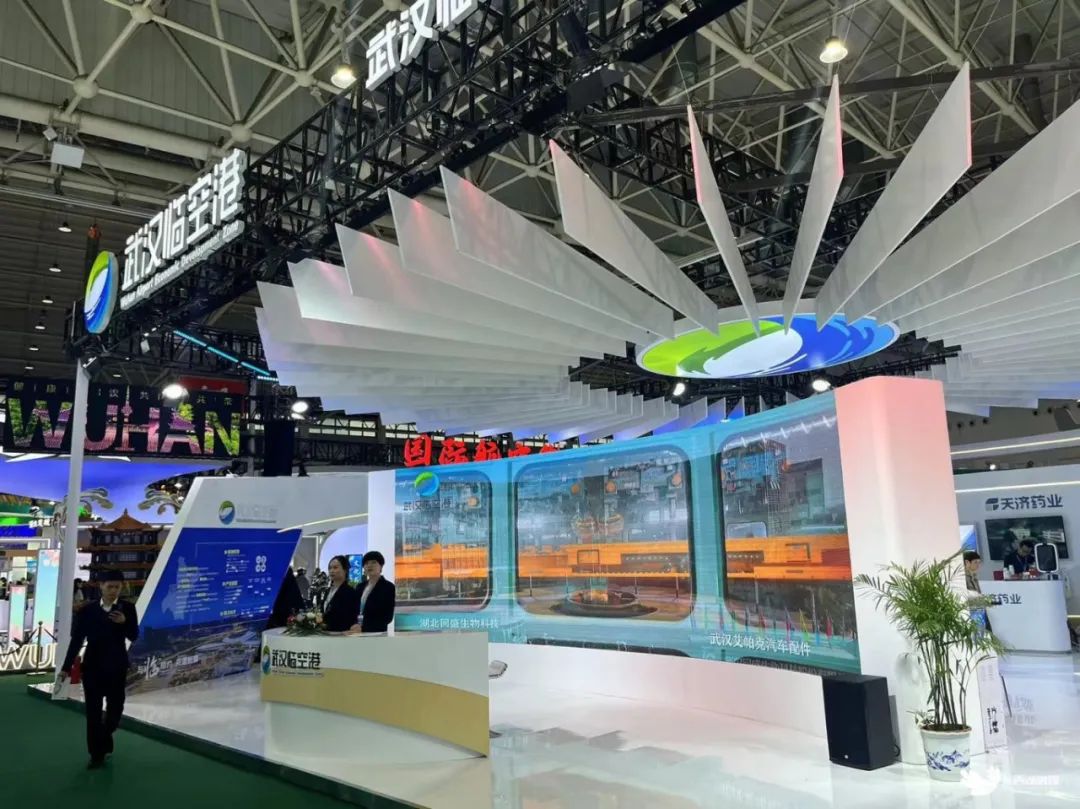 2024年世界大健康博览会主题为“健康共同体 科技创未来”,展出面积10万平方米,参展商1000余家,东西湖展区位于A2健康湖北馆主通道入口。在科技感十足的“飞机引擎”中央造型点缀下,湖北天济药业、武汉润禾生物医药、武汉太福制药、远大医学营养科学(武汉)、武汉迪艾斯科技等5家企业展台两向排开,展示出“武汉临空港 健康芯引擎”的格局与愿景。