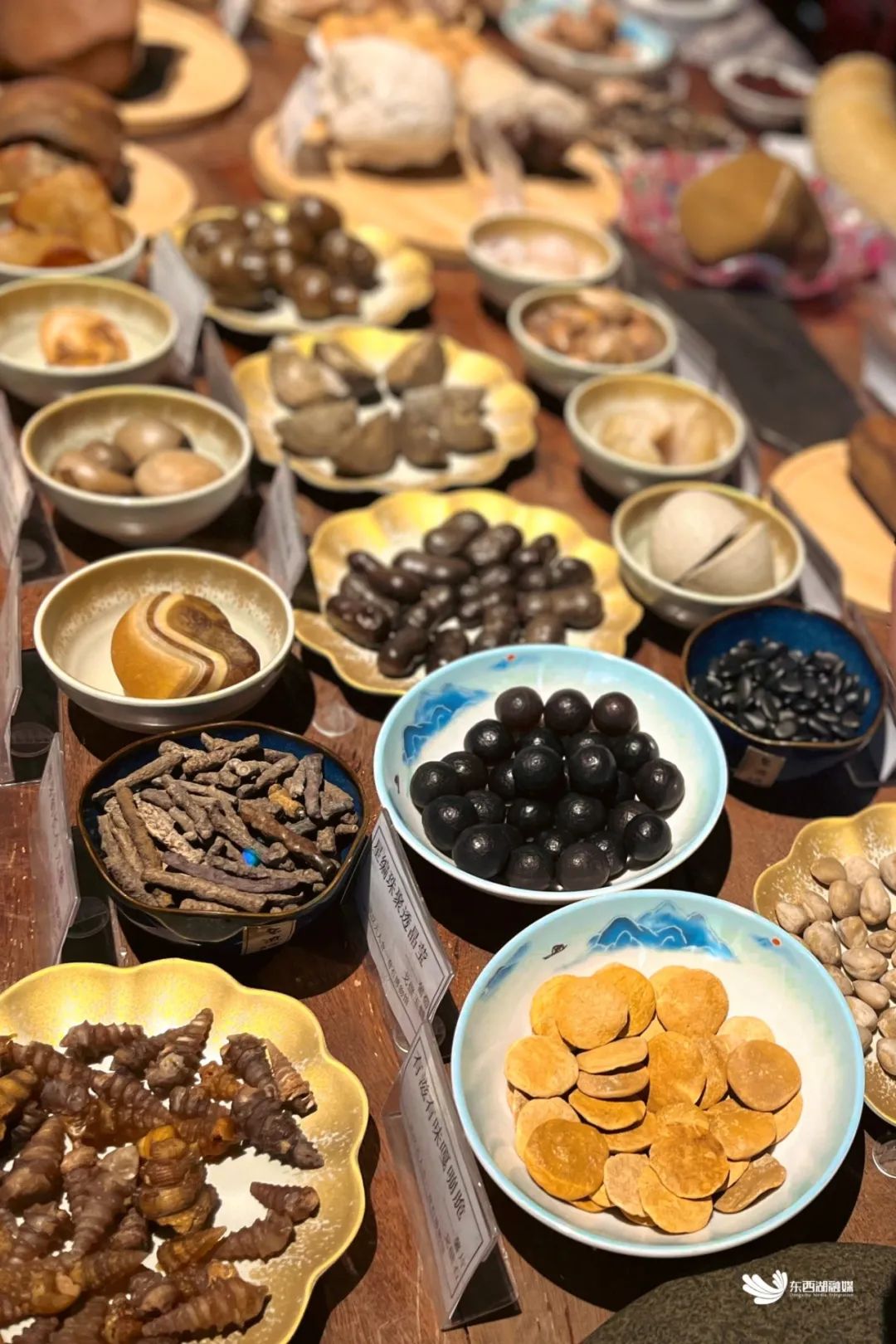 百石宴互动体验区——运用各色石头拼成了108道“佳肴”,包括热菜、海鲜、蔬菜、干果和水果,形神兼备。现场还设置有餐位,配备了餐巾、餐盘、勺子、手电筒等多种道具。看、摸、照、拼、比、拍,全方位感受奇石的无穷创意。