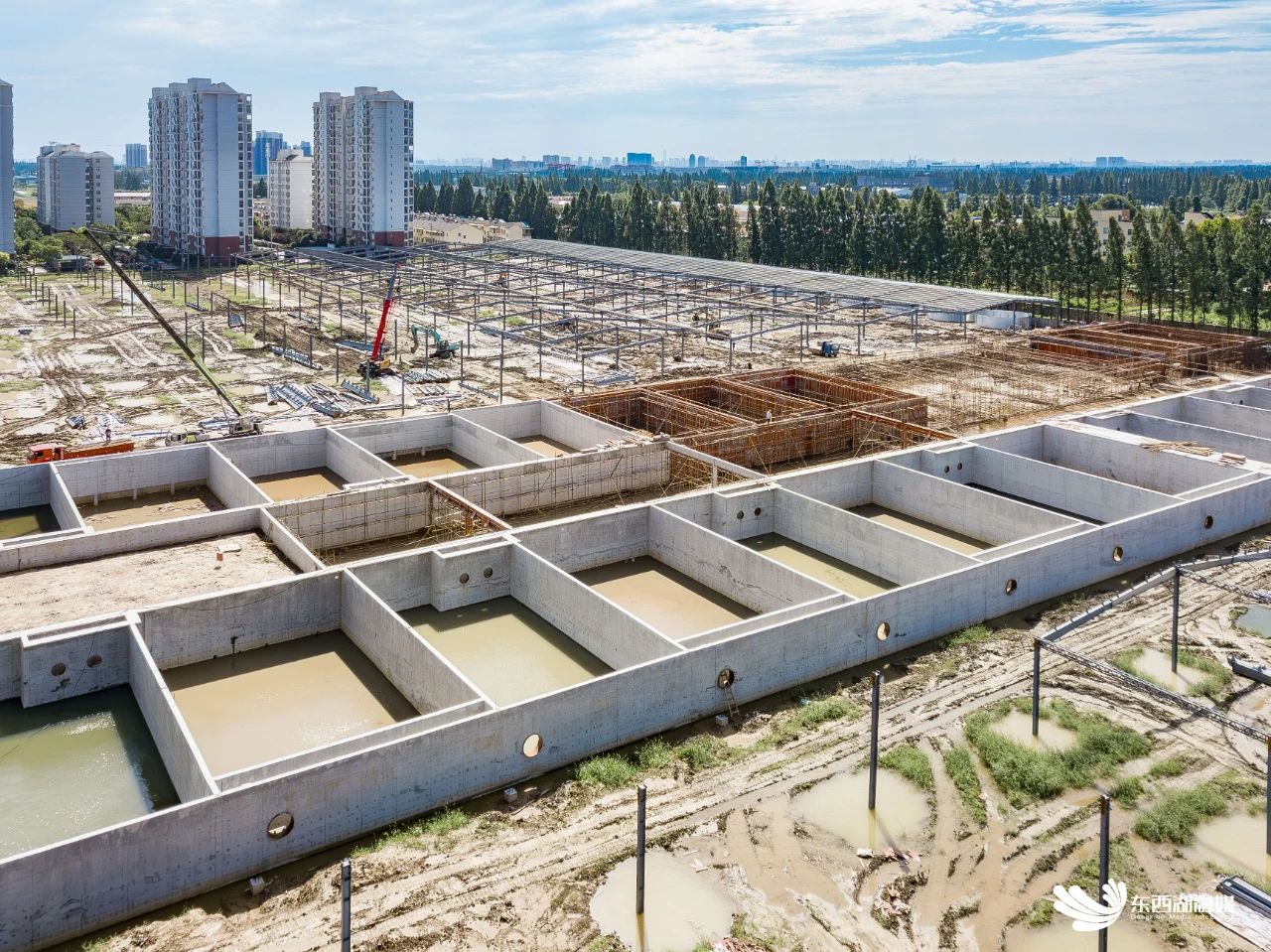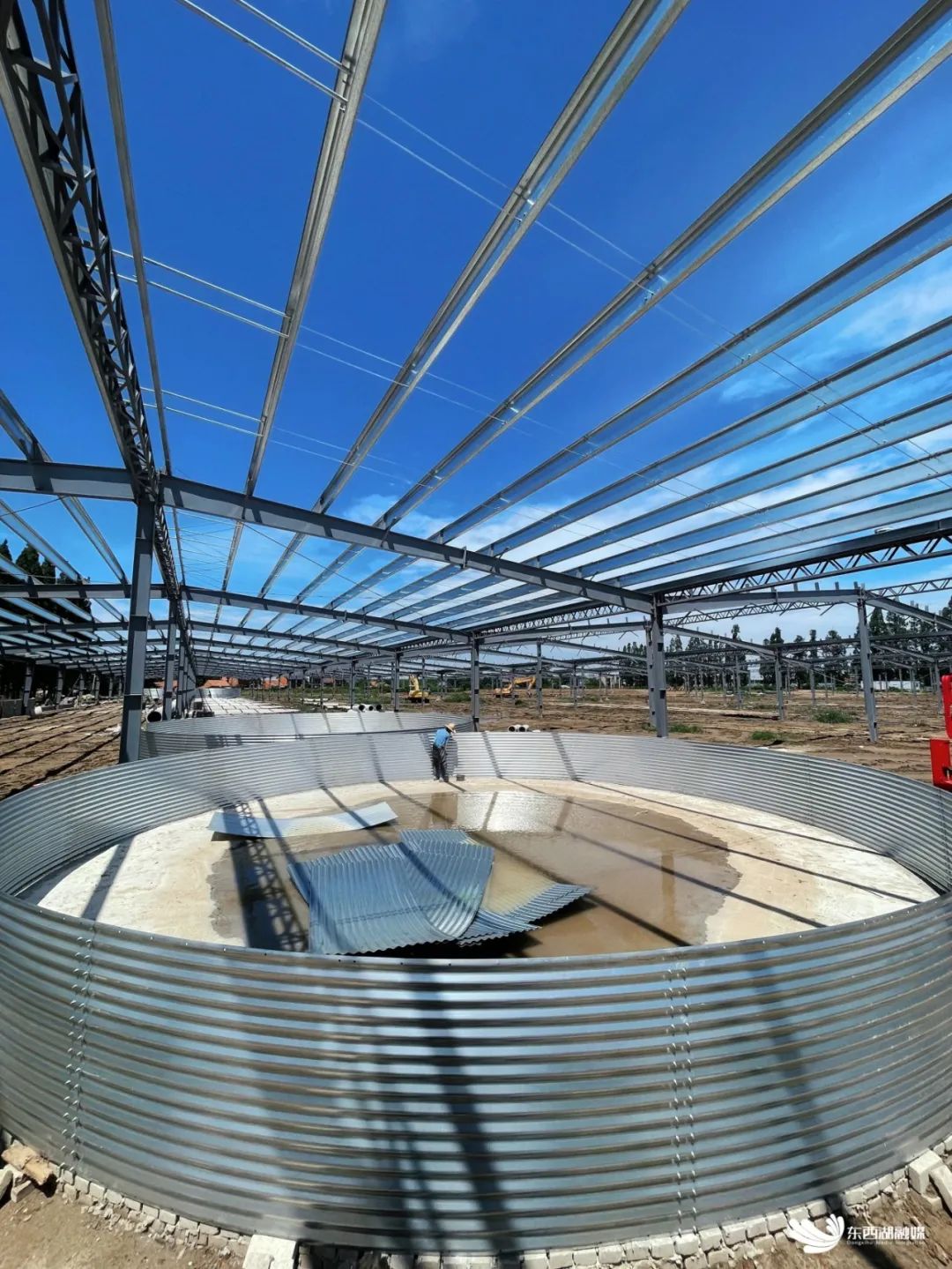 从主养殖区养殖池引出的14组管道,将对接生态环保处理水池。生态环保处理水池建筑面积达4.5万平方米,可实现养殖尾水净化循环使用。按照设计规划,养殖用水每日循环将达到8次。