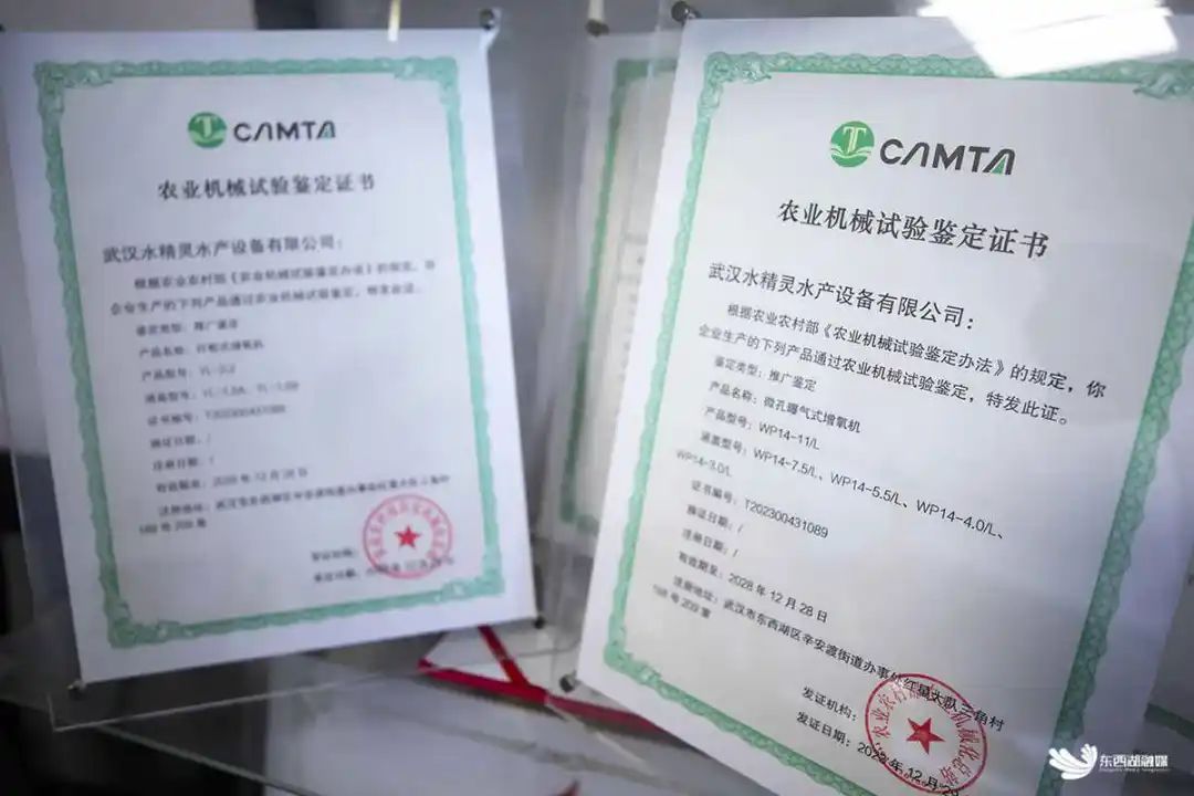 2023年底,水精灵的风送投料机和3款增氧机,顺利通过农业农村部机械化总站检测认定,这是行内最高等级的认定。