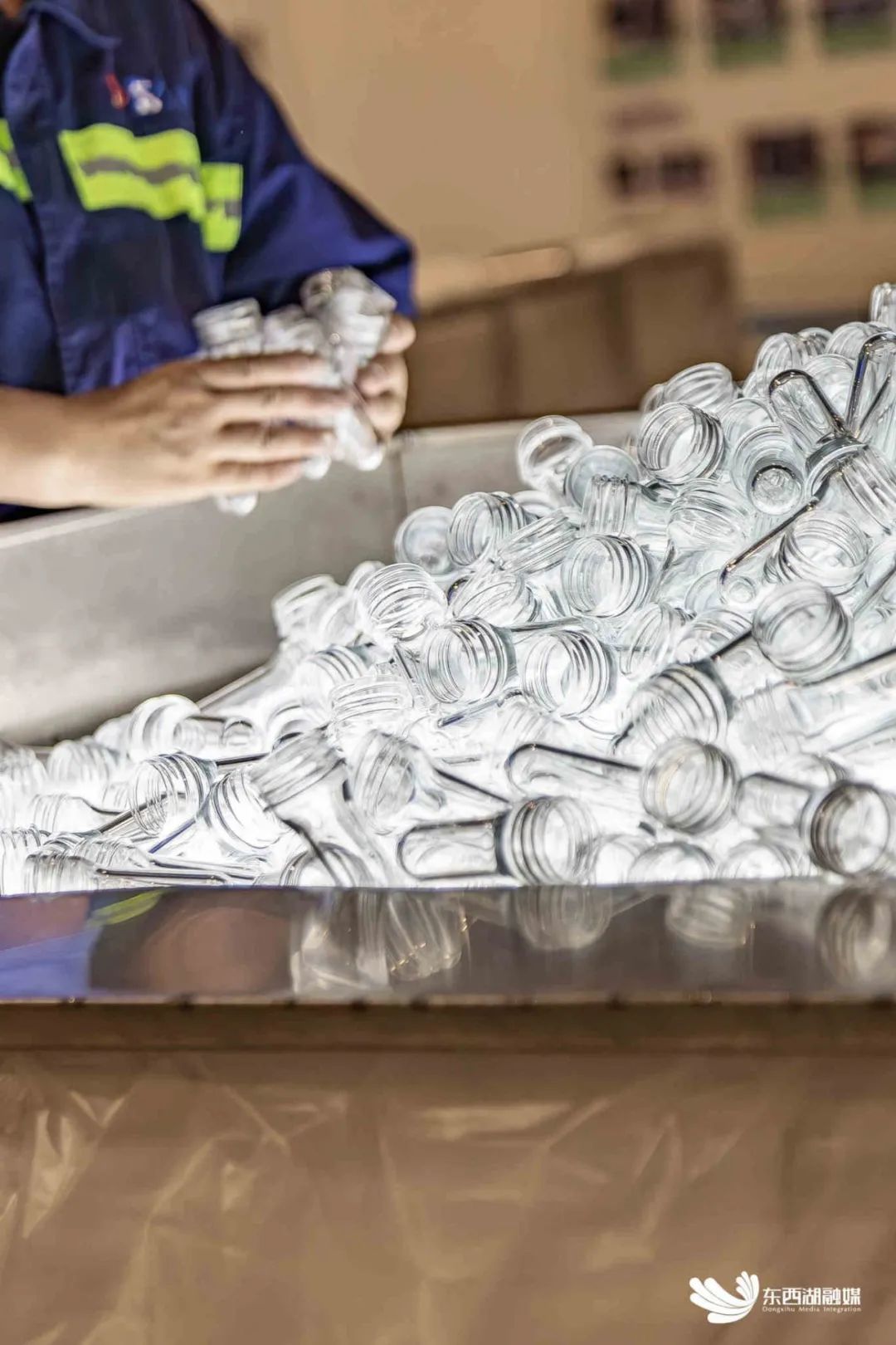武汉紫江生产的PET塑料瓶坯,直线供应东西湖本地的达能脉动工厂和统一武汉工厂。在达能吹塑车间,瓶坯加热器开机预热3至5分钟,将一个个玻璃试管大小的PET瓶坯循环加热一圈,通过高压吹气,5g脉动蓝坯就变成了标准的600ml饮料瓶。